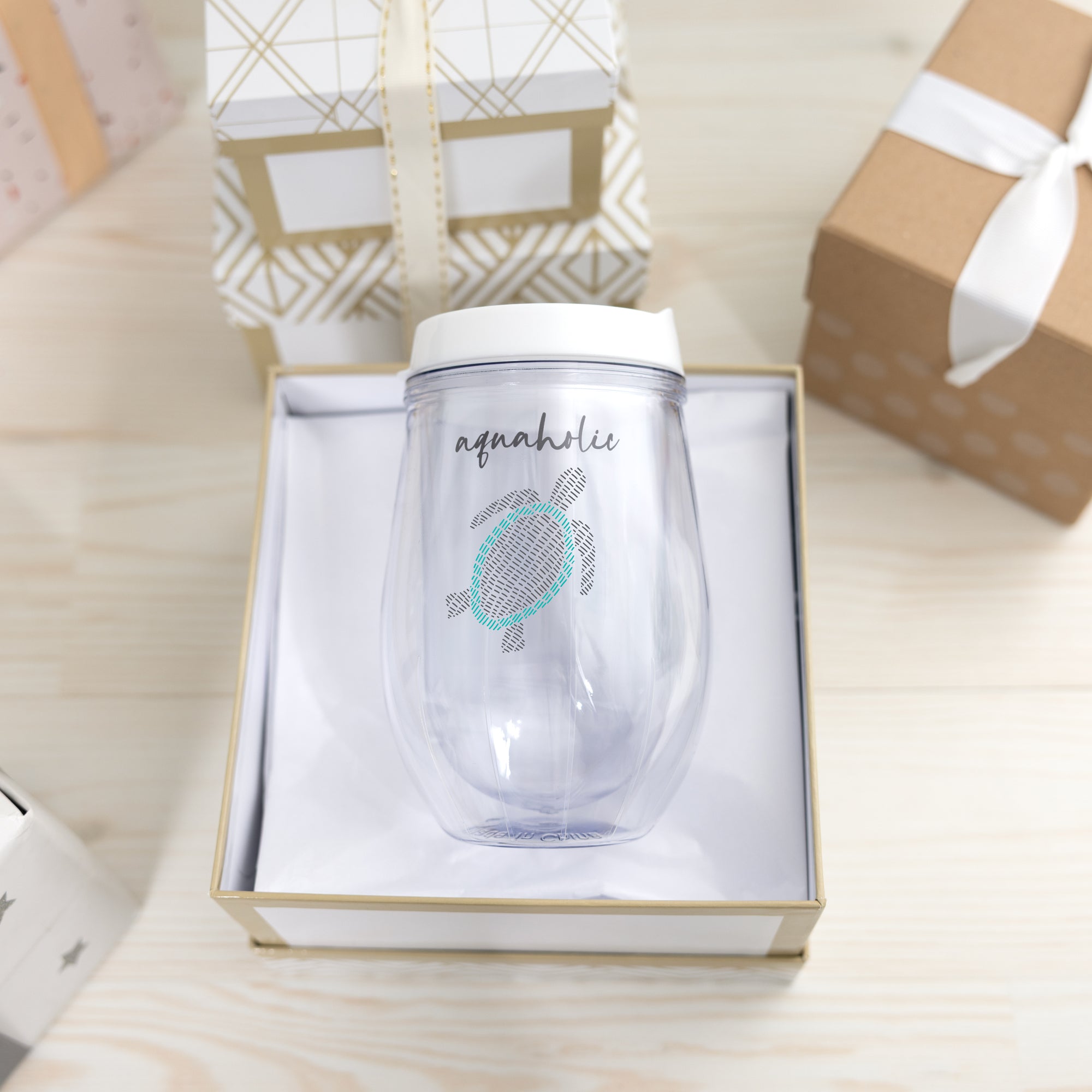 - PREMIUM QUALITY: The 12 oz Aquaholic acrylic stemless wine glass is made from Tritan, combines the beauty of glass with the durability of plastic. Its shatter-resistant and dishwasher-safe properties make it ideal for beach outings, poolside relaxation, or any setting where traditional glassware might not be practical. Featuring a push on lid with a slide to open tab; the lid helps to keep the tumbler leak proof. It’s also Prop 65 approved, meeting rigorous health and safety standards.