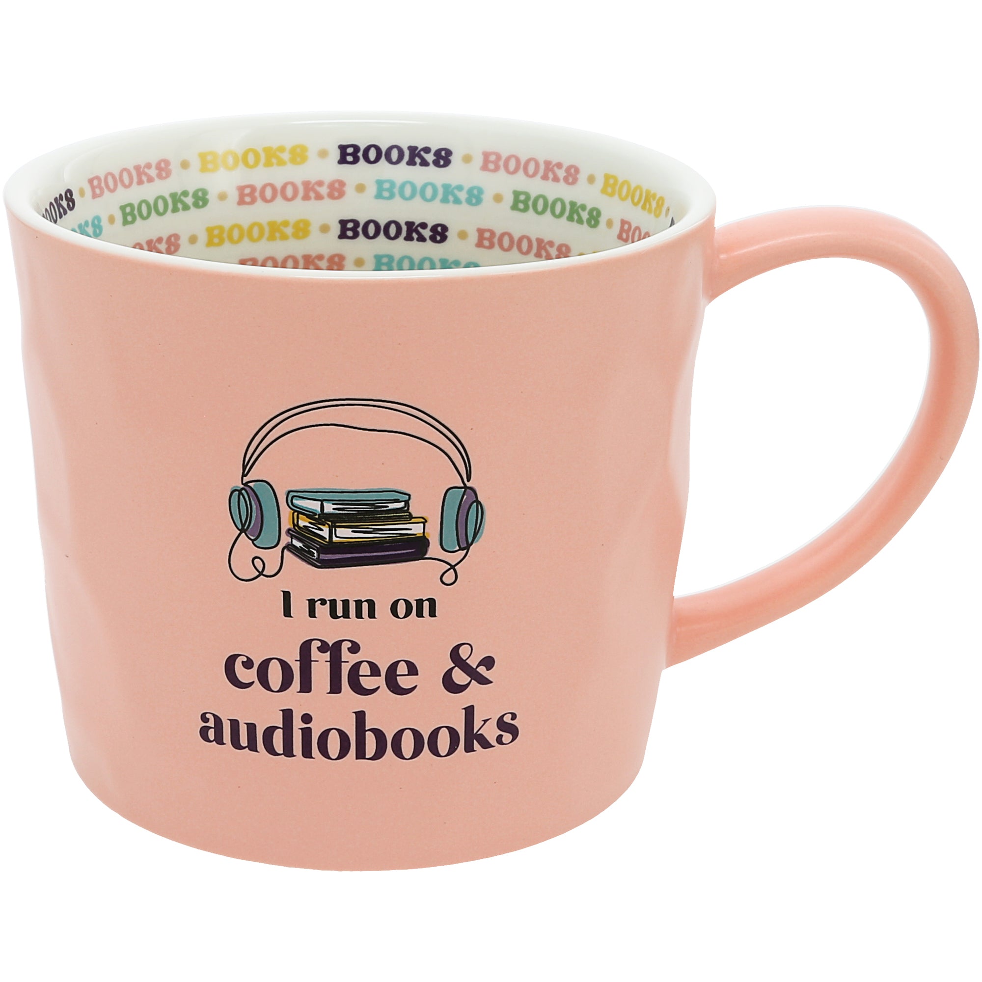 • IN-HOUSE DESIGN: The front features a sweetly illustrated stack of books with headphones around them, paired with pastel block lettering that reads “I run on coffee and audiobooks.” The text is layered with a raised decal effect for added dimension. Inside the rim, a colorful border of the word "books" along the interior, creating a secret surprise with every sip.