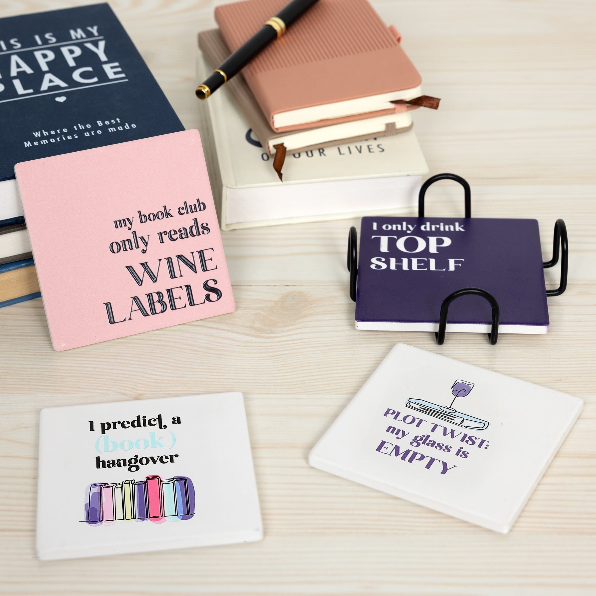 - IN-HOUSE DESIGN: Each coaster showcases a different witty, book-themed phrase in a colorful, artistic style: “Plot Twist: my glass is empty”, “My book club only reads wine labels”, “I predict a (book) hangover”, and “I only drink top shelf”. Housed in a sleek black metal holder for compact storage and stylish presentation, the set reflects modern literary humor with vibrant fonts and cute illustrations like wine glasses and stacked books.