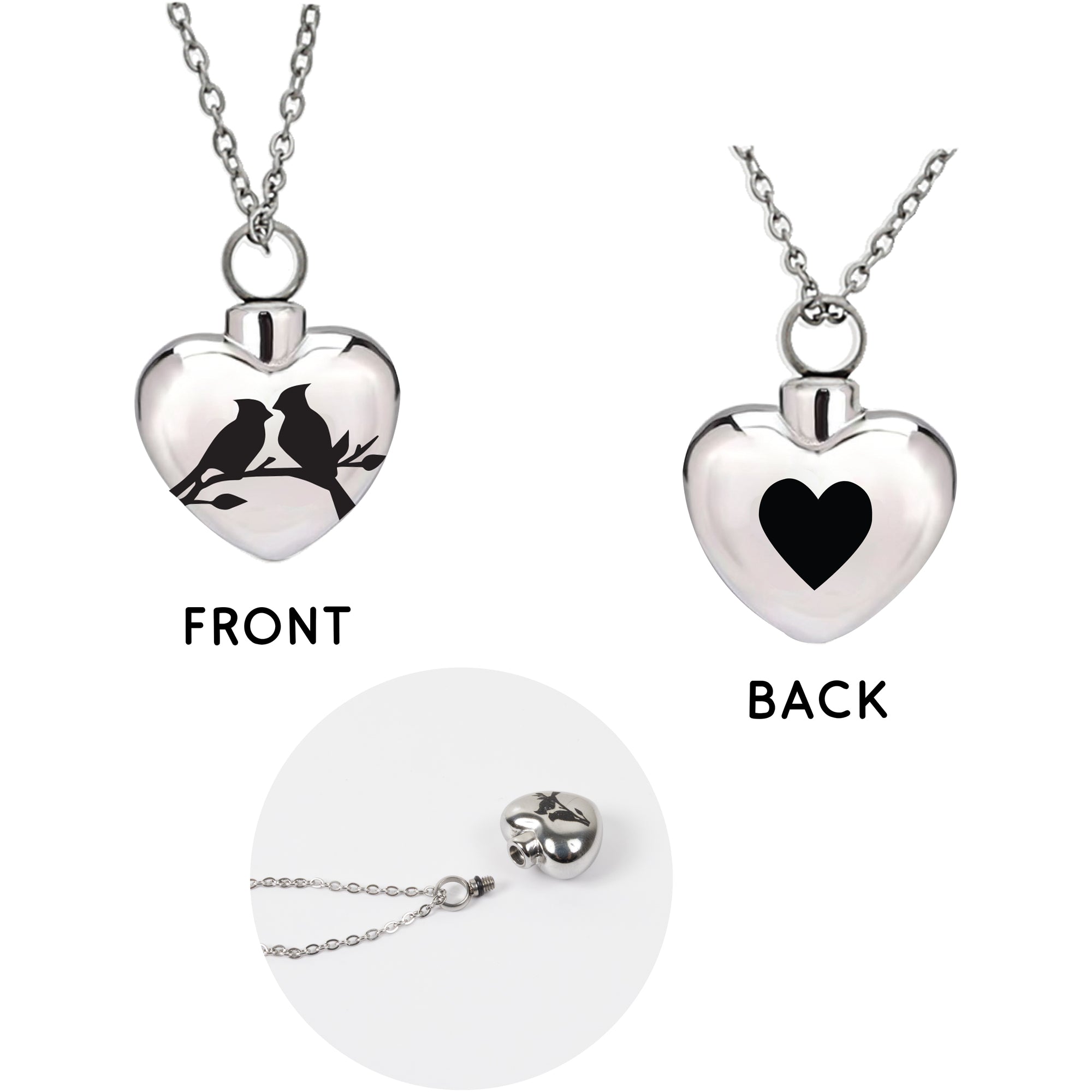 - PREMIUM QUALITY: Crafted from polished stainless steel, this 0.75" x 1.25" heart-shaped memorial necklace offers lasting durability and shine. The front features two engraved cardinals perched on a branch, while the back showcases a heart engraving. The pendant includes a discreet screw-top opening designed to hold a small keepsake such as ashes, dried flowers, or soil from a meaningful place. Includes a 6.5"–18.5" adjustable silver chain, filling kit, and branded box for safe storage or gifting.