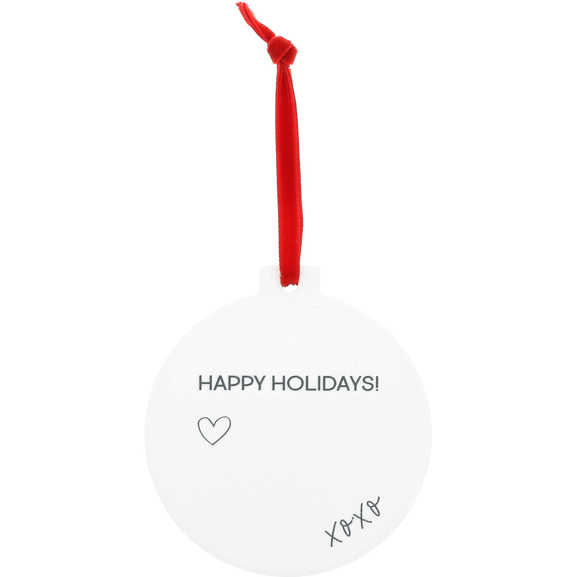 • IN-HOUSE DESIGN: Features an expressive pup peeking out from under a Santa hat with charmingly sketched fur details. On the reverse, the ornament is printed with a “Happy Holidays” message and signature heart accent.