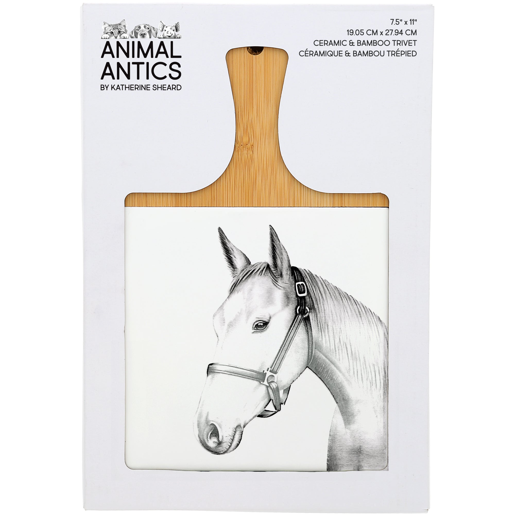 - PREMIUM QUALITY: This 7.5" x 11" x 0.5" decorative trivet is crafted from natural bamboo and features a glossy ceramic tile center showcasing a 3D-printed horse illustration. The smooth bamboo frame includes a convenient handle with a hanging hole, making it easy to display as wall décor or use as a tabletop accent. With its combination of durable wood texture and glossy tile artwork, this trivet serves as a beautiful, animal-inspired home accent. Packaged in a custom printed box inside a secure shipper for protection.