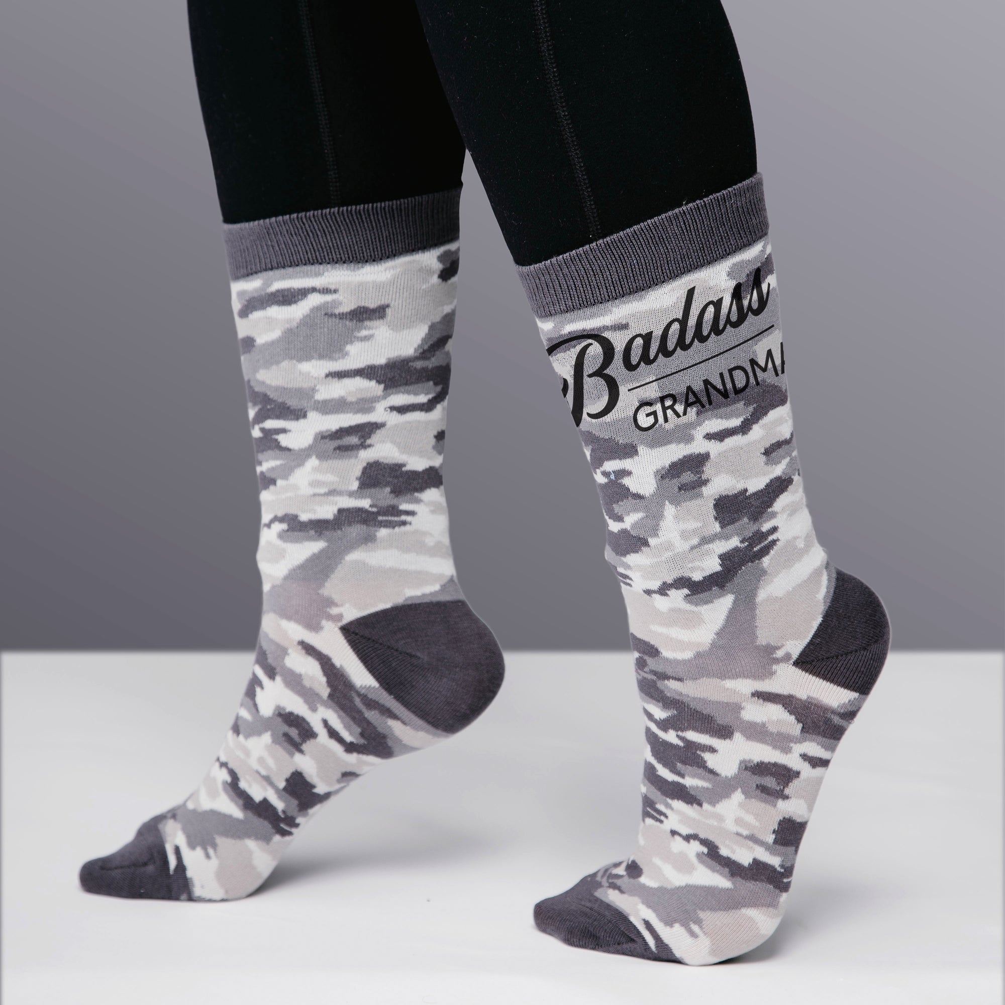 - IN-HOUSE DESIGN: "Badass Grandma" is sewn into the outside upper of the crew socks on both socks in black. Ankle, heel & toe are a solid gray color. At the same time, the body combines four different gray tones that make up a camo pattern.