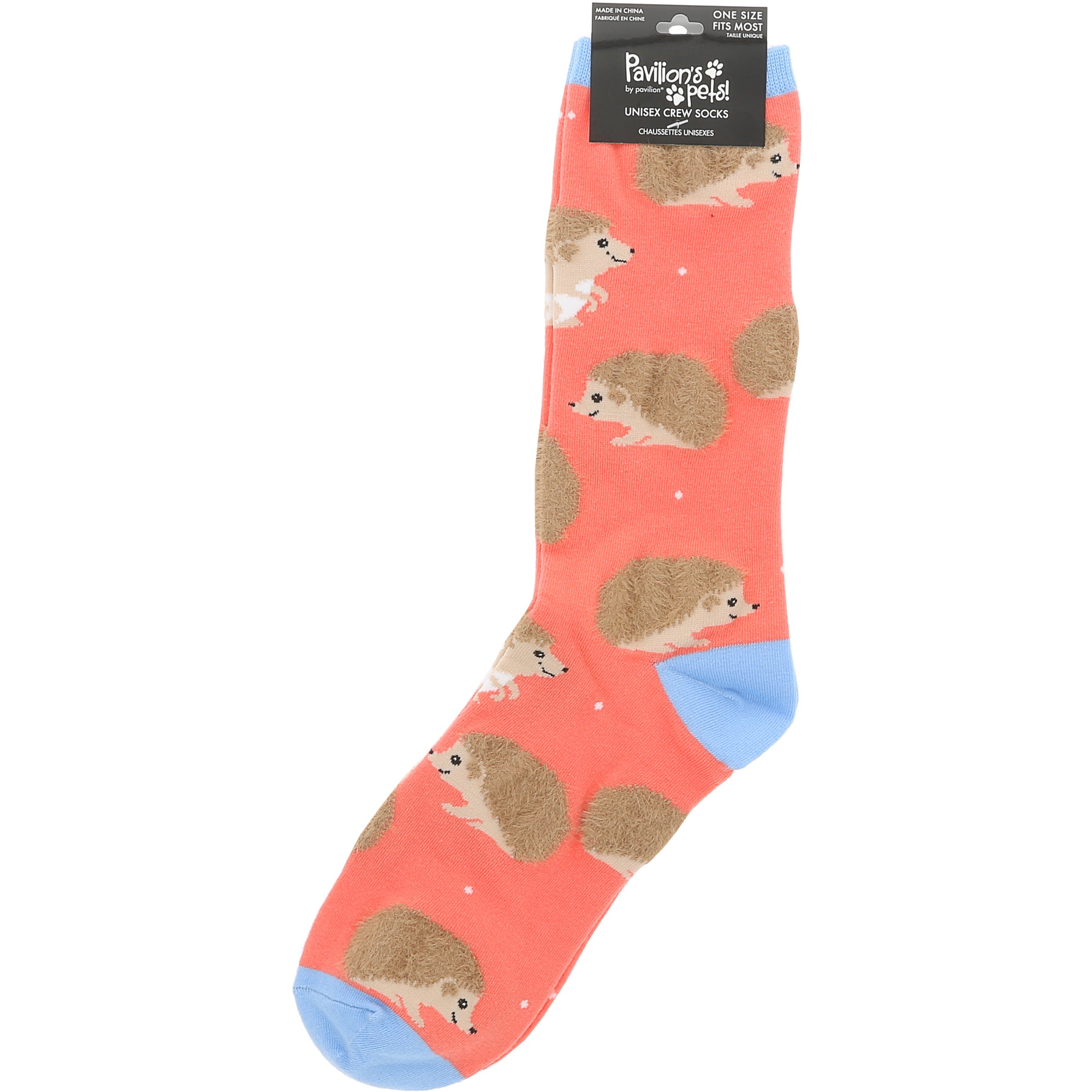 - IN-HOUSE DESIGN: These pastel coral-pink socks are dotted with irresistibly cute illustrated hedgehogs, each in a slightly different pose—some curled up, others waddling around. Set against a soft pink background, the cozy blue toe and heel add contrast and enhance the overall playfulness of the design, making these socks both adorable and eye-catching.