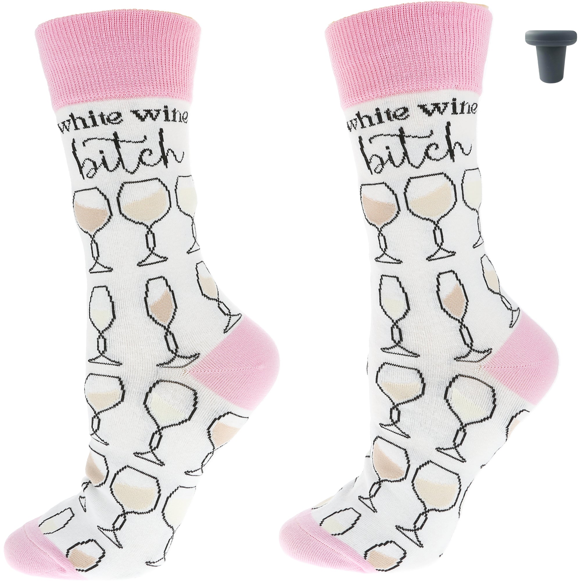 - IN-HOUSE DESIGN: With an all-over design featuring delicate white wine glasses, these socks are both fun and stylish. The sentiment "White Wine Bitch" adds a cheeky touch, while the light pink accents on the heel, toe, and cuff bring out the design’s playful vibe. The detailed artwork and thoughtful color scheme make these socks a great match for any wine enthusiast’s wardrobe.