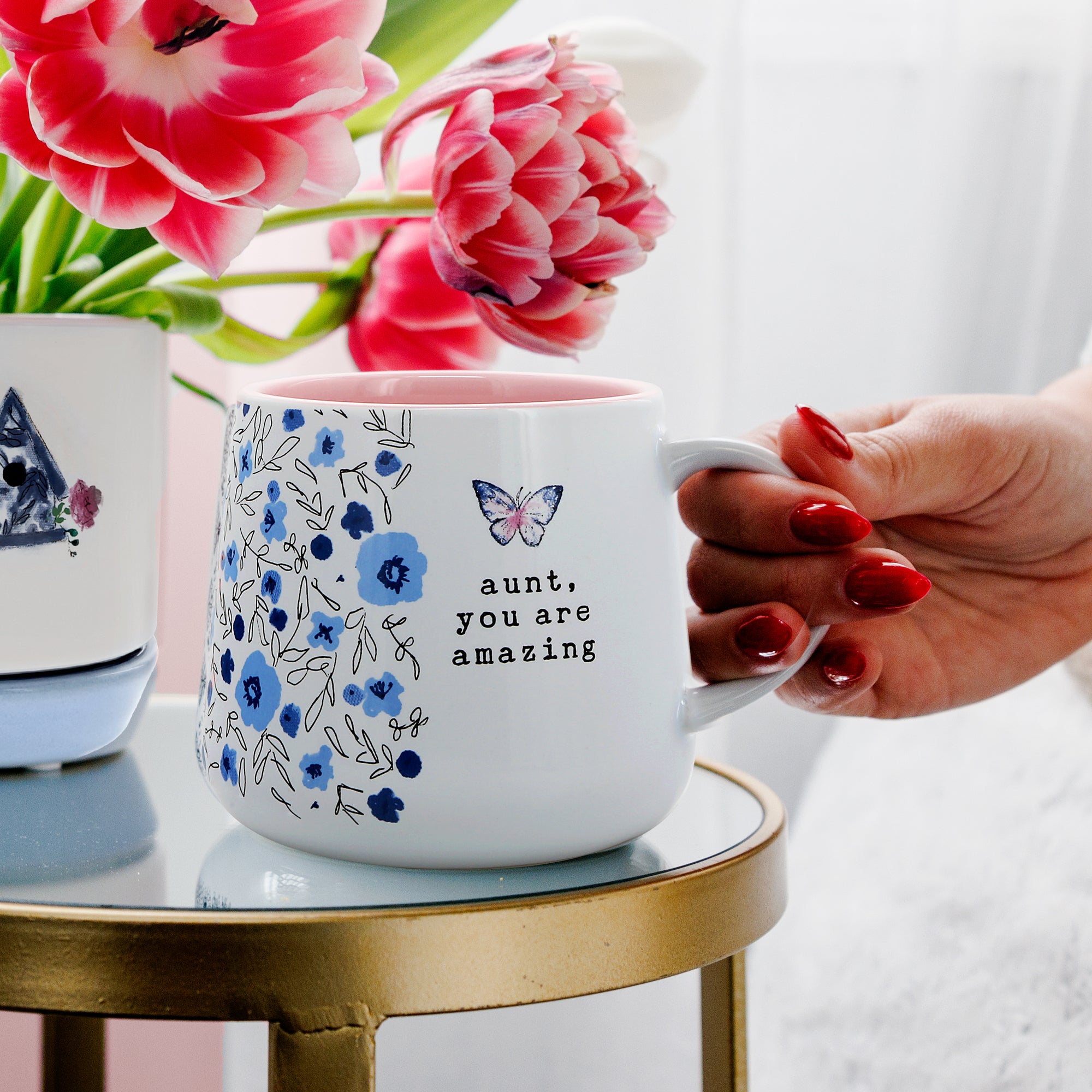 - IN-HOUSE DESIGN: You will see a typewriter written an "Aunt, You Are Amazing" sentiment next to a purple/pink butterfly design. A light pink glossy interior smooth-edged vessel with a glossy exterior with walls that black & white floral design along with a light and dark blue poppy flower design that wraps around 3/4 the entire mug.