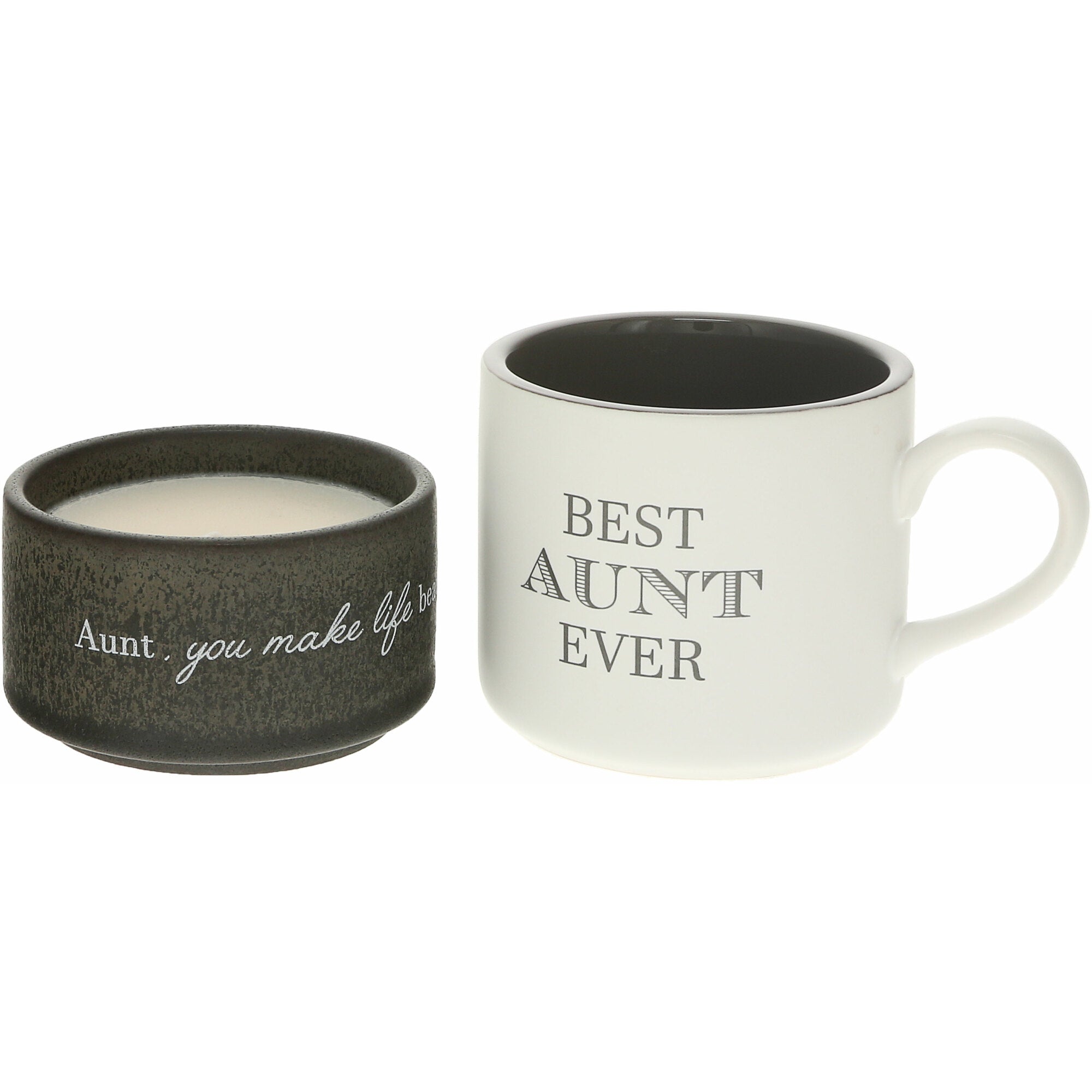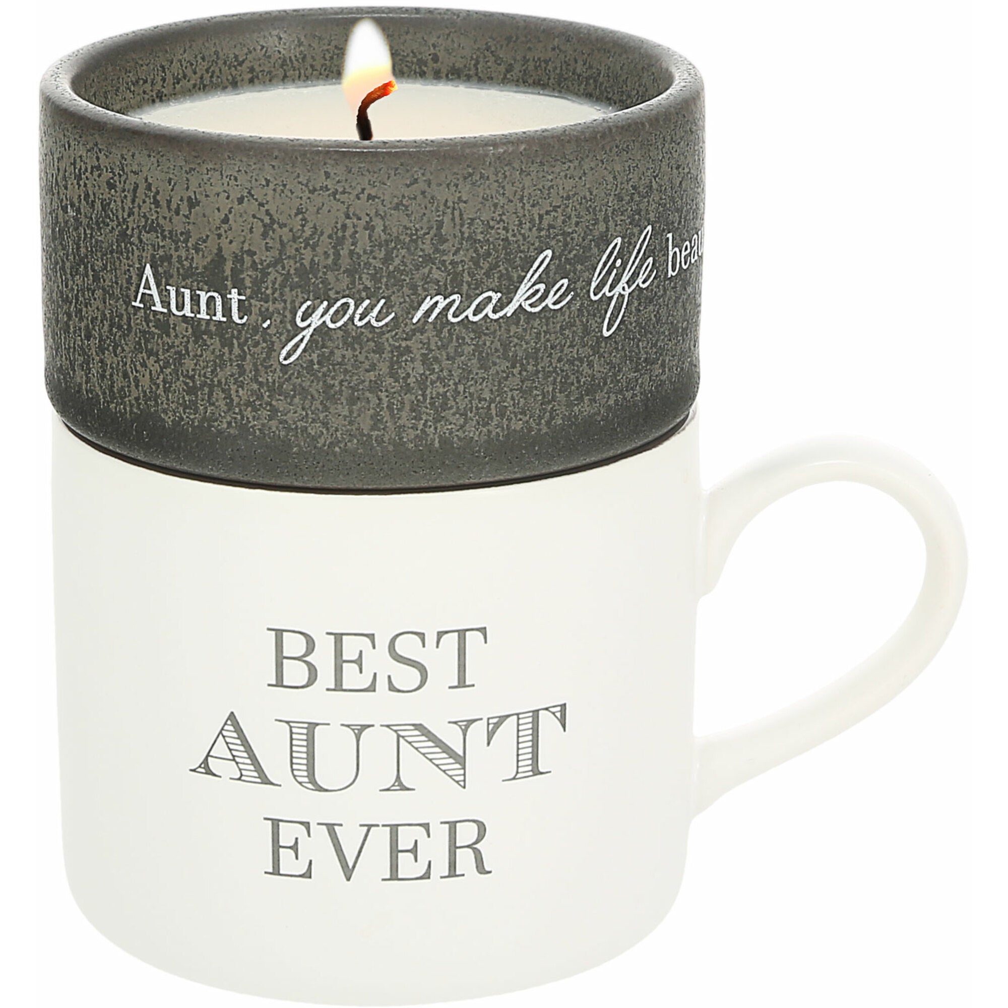 - IN-HOUSE DESIGN: Wrap-around white sentiment on the candle, "Aunt, You Make Life Beautiful And A Lot Of Fun." Gray mug sentiment "Best Aunt Ever" on the front side of the mug only. Faces towards you in the right hand or outward in the left hand.