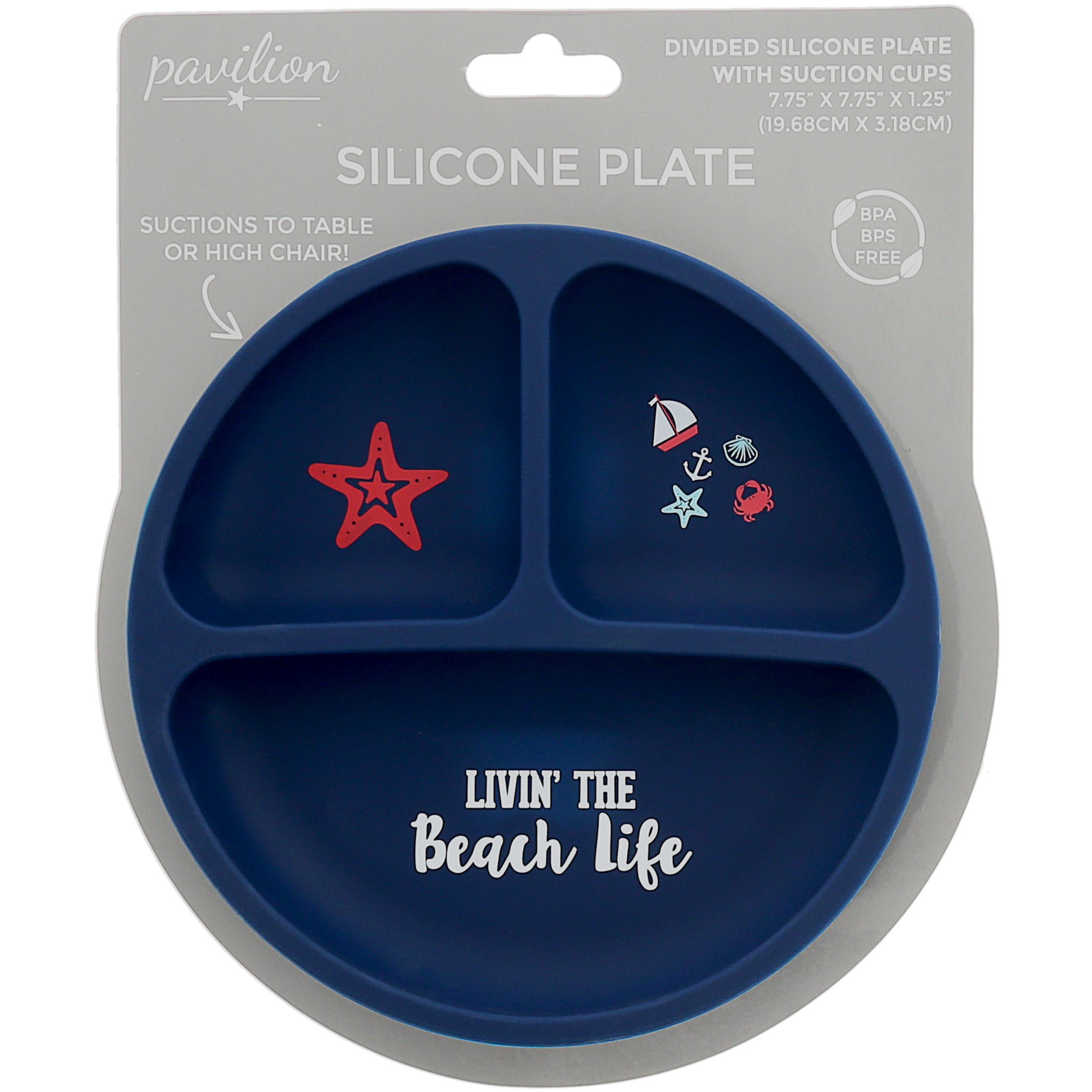 - PREMIUM QUALITY: 7.75" round x 1.25" tall food-grade silicone plates have a three-section design with two smaller sections on top and one long section on the bottom. There are four suction cups on the bottom side of the dish to prevent little ones from picking up their plate and dumping it.