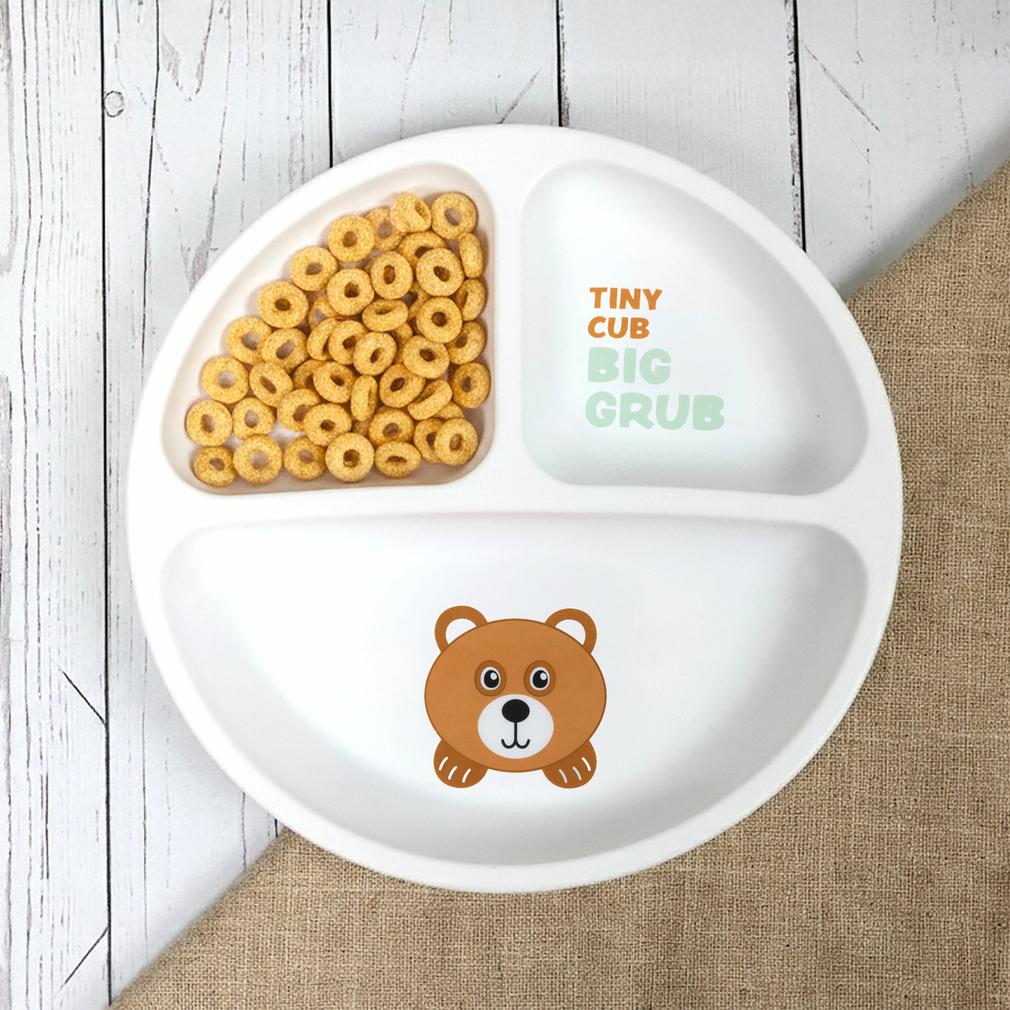 • IN-HOUSE DESIGN: Features a sweet baby bear illustration paired with the phrase “Tiny Cub, Big Grub.” The three divided sections help introduce balanced meals and support toddlers who prefer their foods separated. The soft neutral color palette complements modern nursery and kitchen décor.