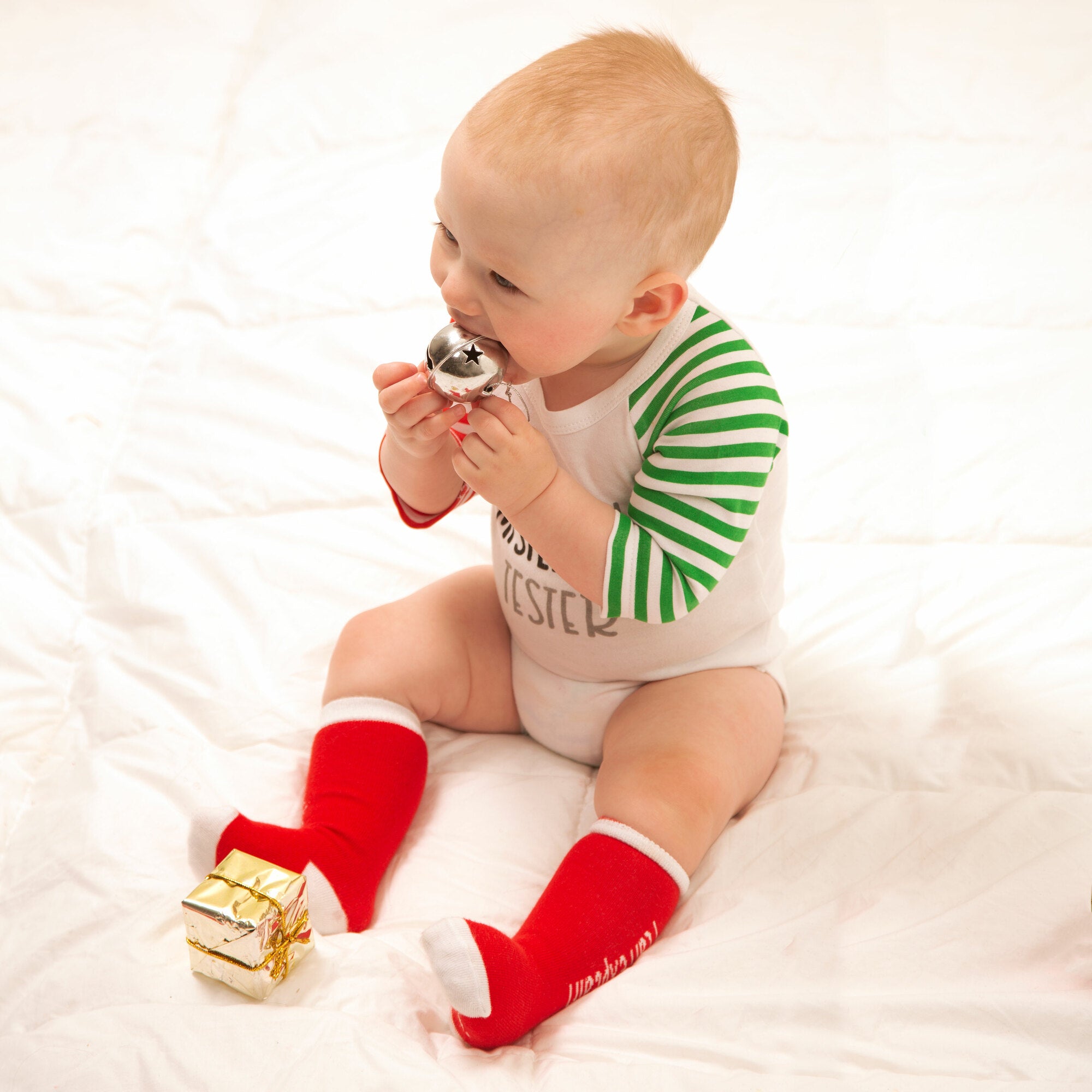- IN-HOUSE DESIGN: "Official Mistletoe Tester" text is printed onto the front of the bodysuit.
