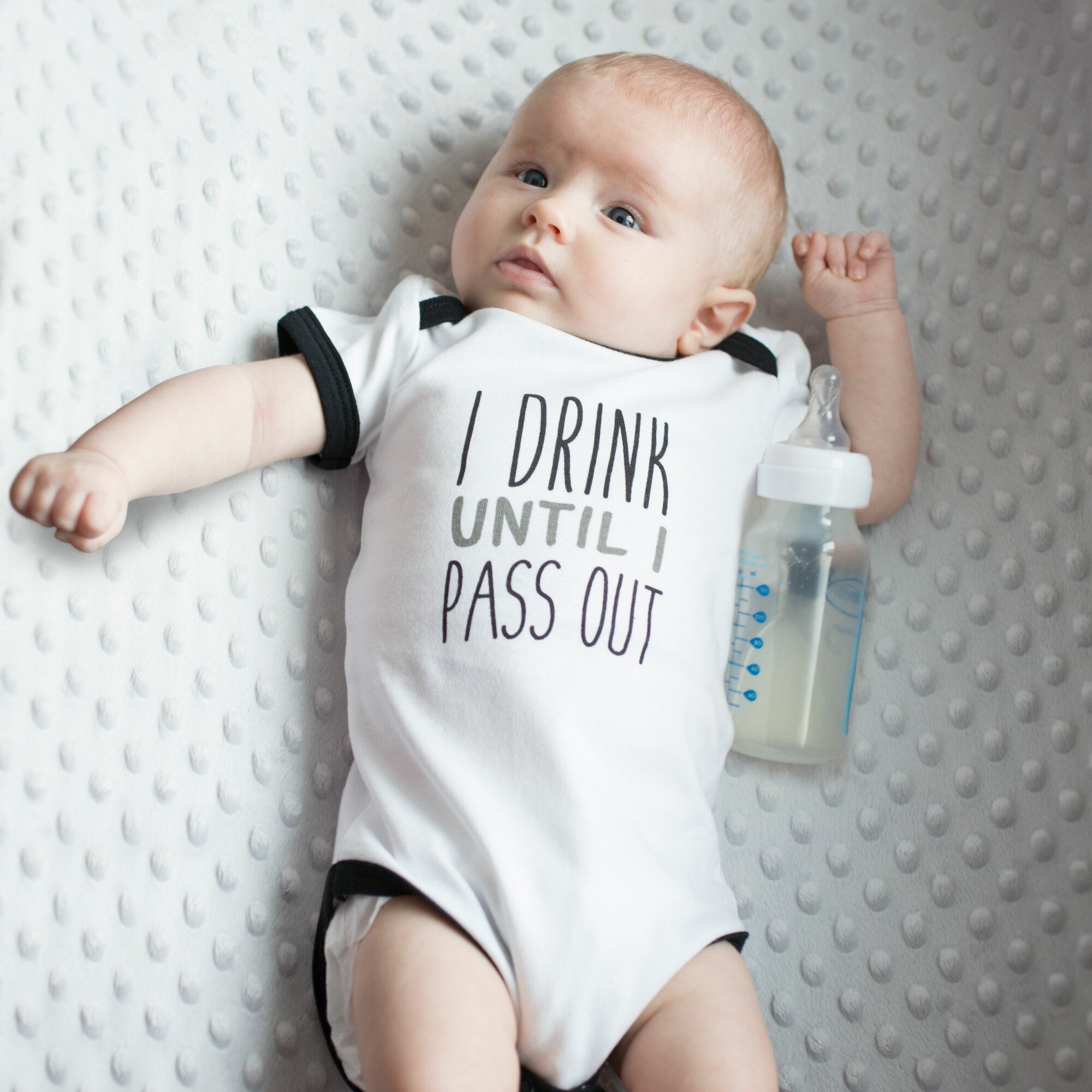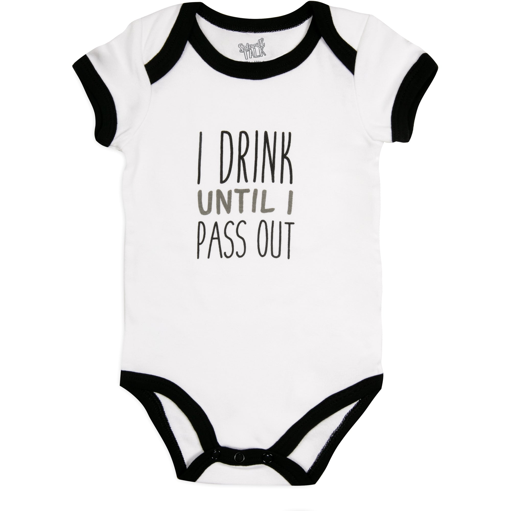 - IN-HOUSE DESIGN: "I Drink Until I Pass Out" text is printed onto the front of the bodysuit.