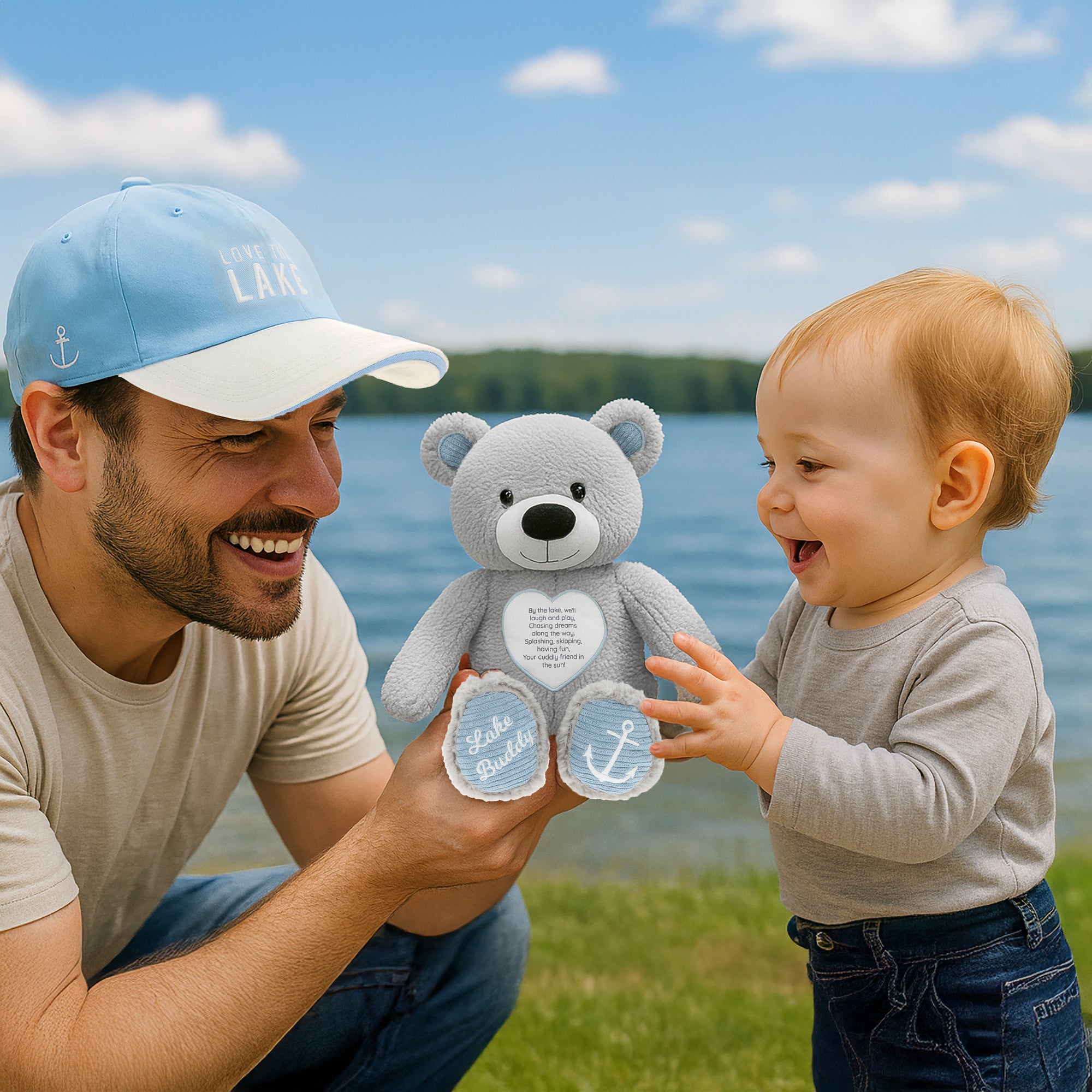 - IN-HOUSE DESIGN: This bear wears a soft embroidered heart that reads “Lake Buddy” with an anchor icon on its paw, evoking breezy lakeside fun. The attached fabric sentiment poem on the chest reads: “By the lake, we'll laugh and play, Chasing dreams along the way. Splashing, skipping, having fun, Your cuddly friend in the sun!”
