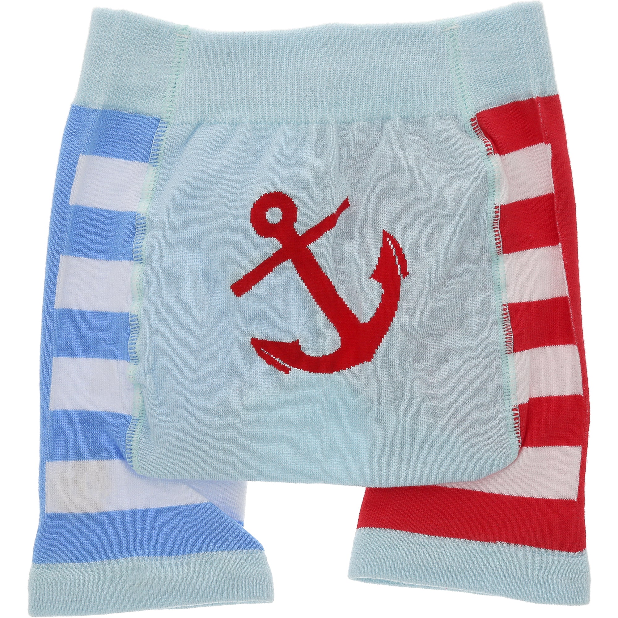 - IN-HOUSE DESIGN: The waistband, bum, and over-the-knee trim are light blue. One leg is white and blue striped, and the other is red and white striped on the backside only. The front legs are a solid blue and solid red split down the middle. The backside features a large red anchor; the front features the same anchor on a smaller scale.