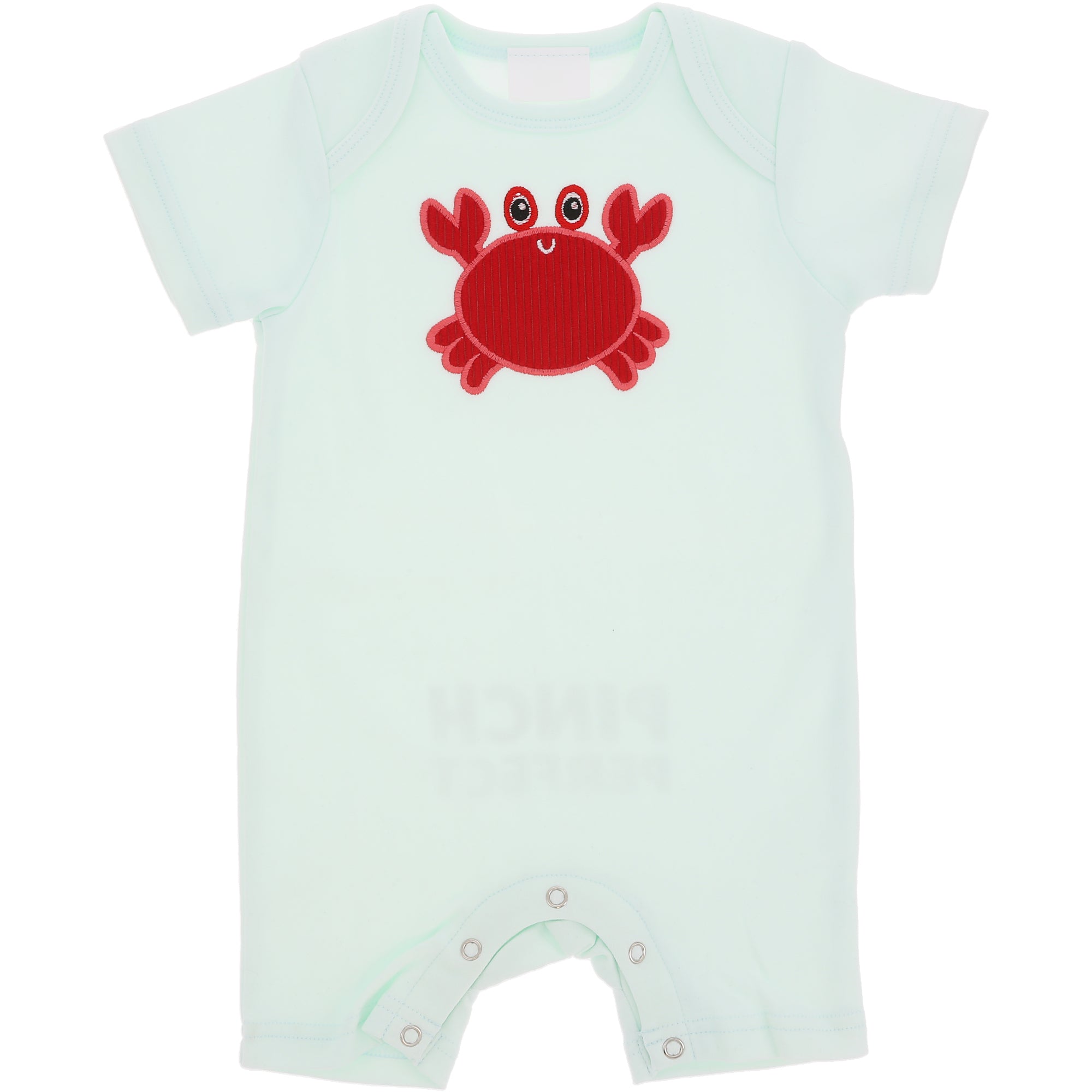 • IN-HOUSE DESIGN: Features an adorable red crab appliqué on the front with raised embroidery that adds playful texture and visual interest. The back showcases the phrase “Pinch Perfect” in bold printed lettering, adding a fun surprise detail. The soft seafoam color palette and cheerful coastal theme create a light, summery look that feels fresh, happy, and perfectly suited for warm-weather adventures.