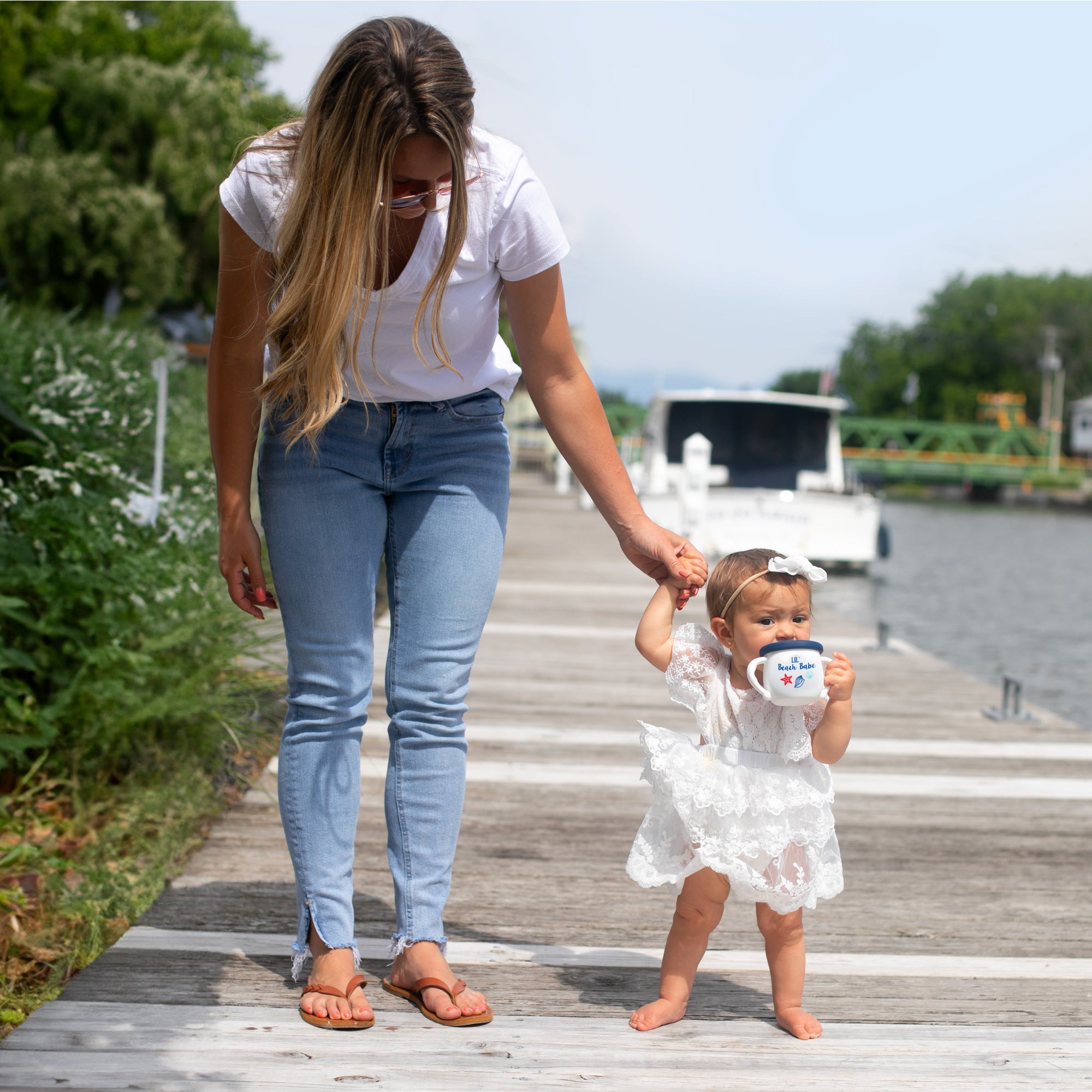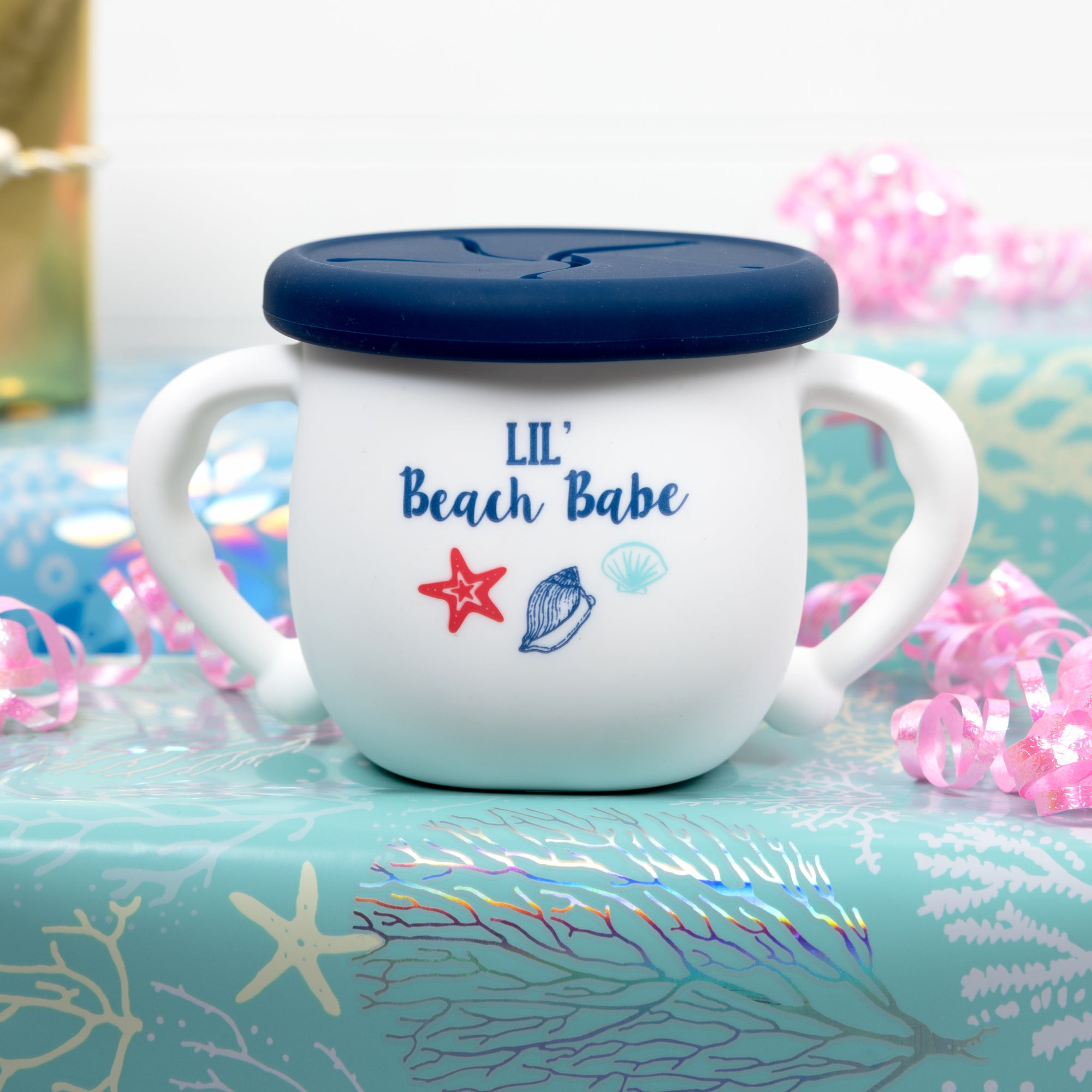 • IN-HOUSE DESIGN: The bowl's body is white with a navy-blue lid. The blue & red starfish & shell pattern on the front side is accompanied by "Lil' Beach Babe" blue sentiment.