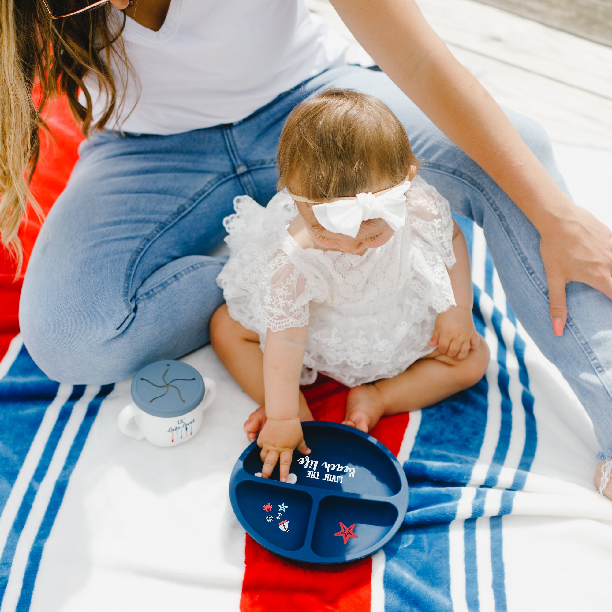 - PREMIUM QUALITY: 7.75" round x 1.25" tall food-grade silicone plates have a three-section design with two smaller sections on top and one long section on the bottom. There are four suction cups on the bottom side of the dish to prevent little ones from picking up their plate and dumping it.