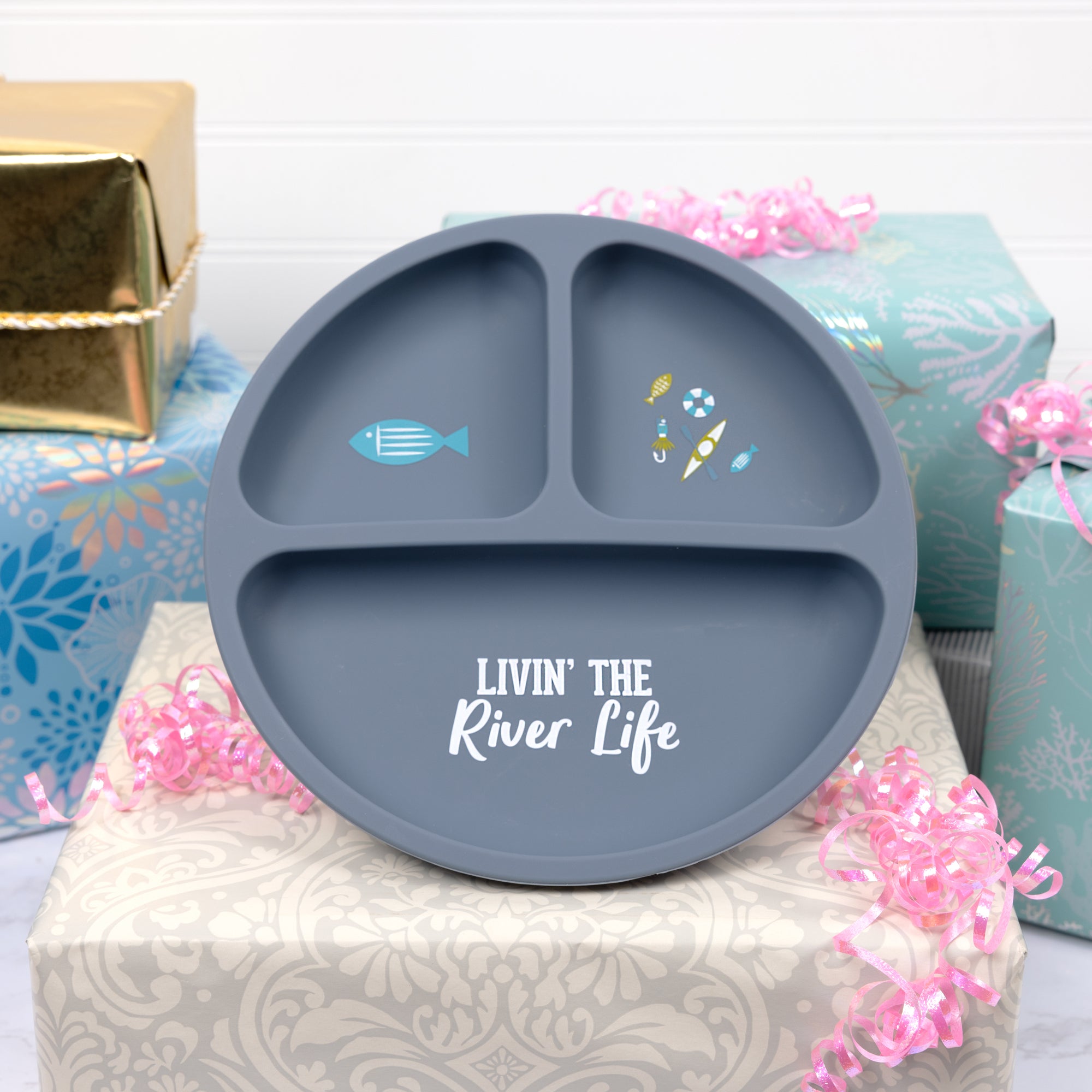 • IN-HOUSE DESIGN: The plate's body is gray. The "Livin' The River Life" is in the biggest section. The smaller left area has a blue fish, whereas on the right side is a canoe, a few fishies, a lifesaver, and a fish hook.