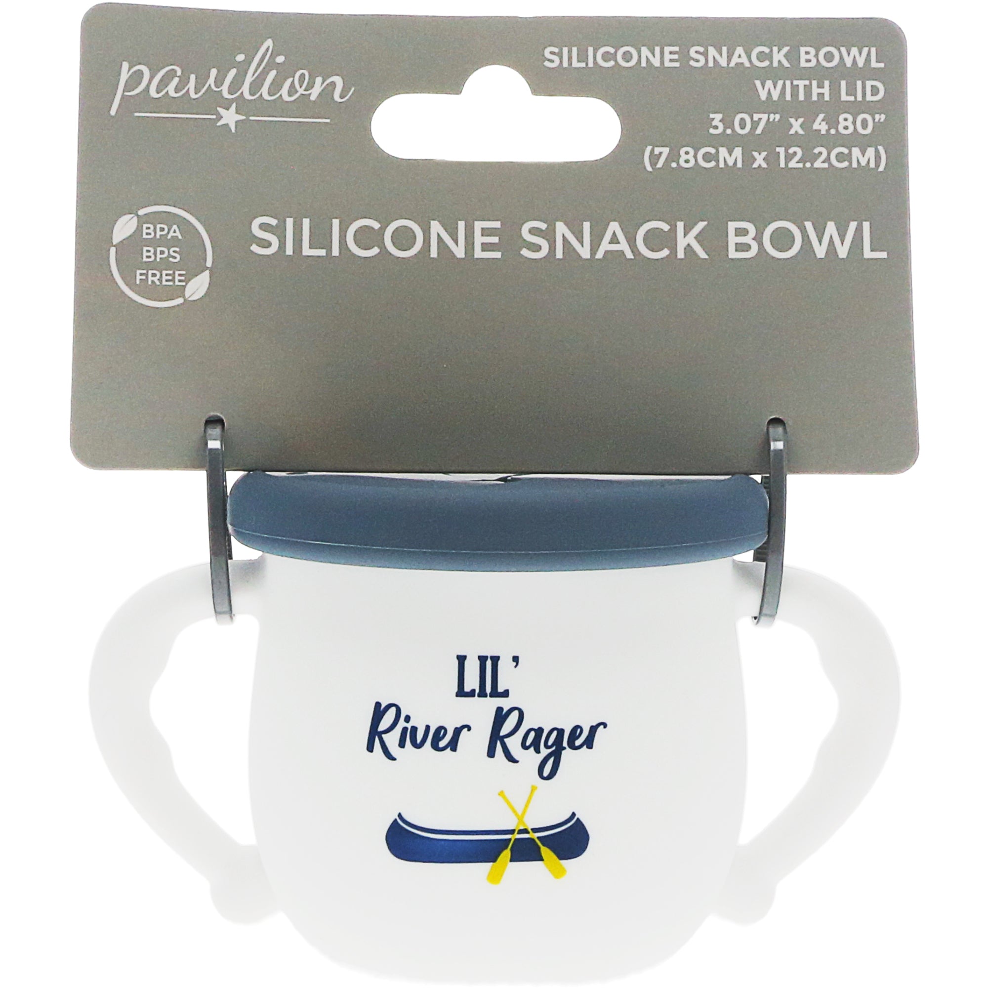 - IN-HOUSE DESIGN: The bowl's body is white with a gray lid. The gray & green canoe/oars on the front side are accompanied by "Lil' River Rodger" gray sentiment.