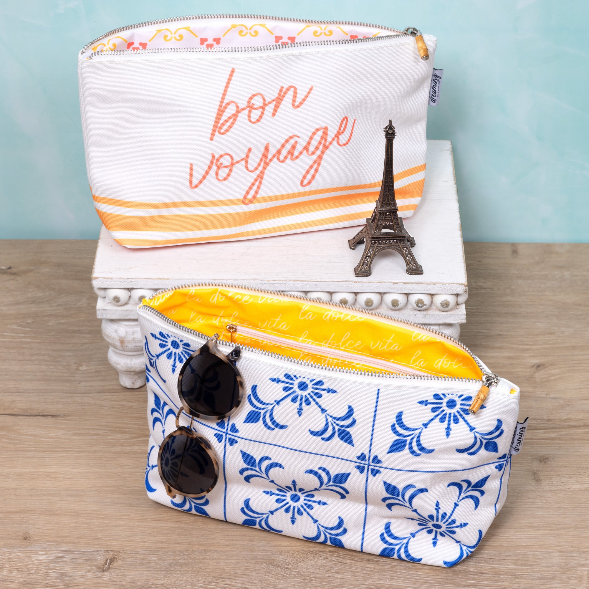 - IN-HOUSE DESIGN: The "Bon Voyage" pouch captures the breezy spirit of Mediterranean travels with its warm white and orange design, accented by a playful striped pattern and bold "Bon Voyage" script. The printed artwork is vibrant and inviting, making this pouch both stylish and functional. Each piece is complete with a side logo tag and bottom logo, showing attention to detail that adds sophistication to this travel-ready accessory.