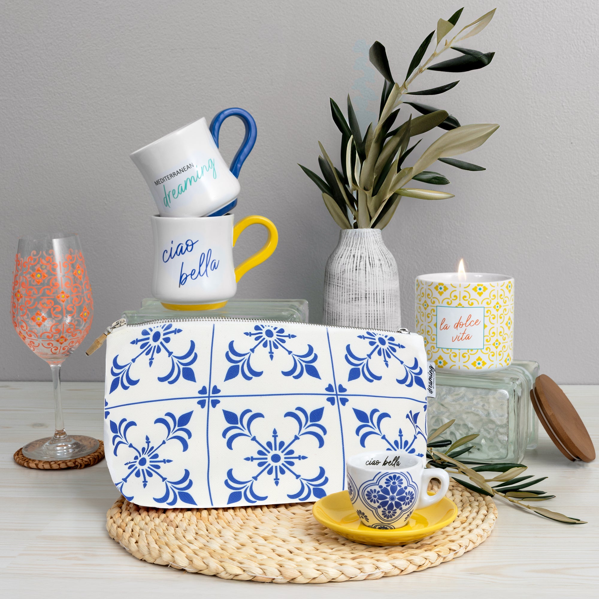 - IN-HOUSE DESIGN: Inspired by the relaxed elegance of Mediterranean style, this pouch showcases a blue and white tile pattern reminiscent of classic Italian decor. Inside, you’ll find the phrase “La Dolce Vita” repeated against a yellow backdrop, bringing an element of charm and positivity every time you open it. Featuring a sewn-in logo tag on the side and a subtle logo at the bottom, this design is as thoughtful as it is beautiful, making it a stylish and functional accessory for any journey.