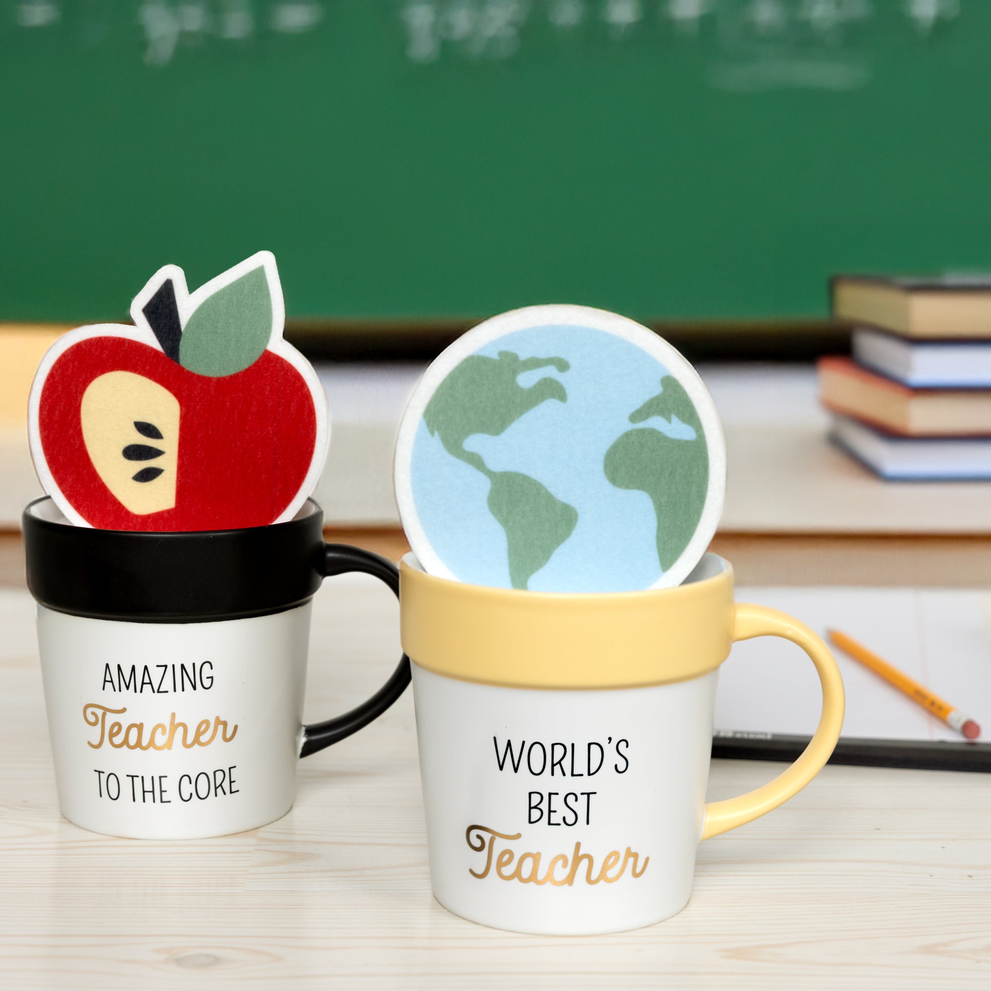 - IN-HOUSE DESIGN: From the Teachable Moments collection, this set features the sentiment “Amazing Teacher to the Core” with an apple-shaped coaster symbolizing knowledge and growth. The color palette of black, red, and gold was chosen to feel bold yet timeless—celebrating educators who inspire every day. Both mug and coaster include printed artwork that ties the theme together seamlessly.