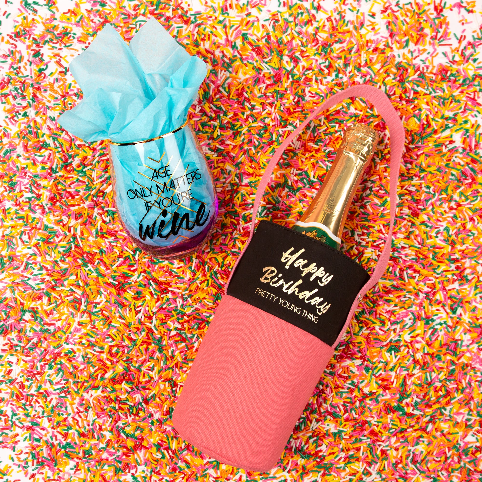 - IN-HOUSE DESIGN: "Happy Birthday Pretty Young Thing" text is laser-printed onto the front of the bottle bag.