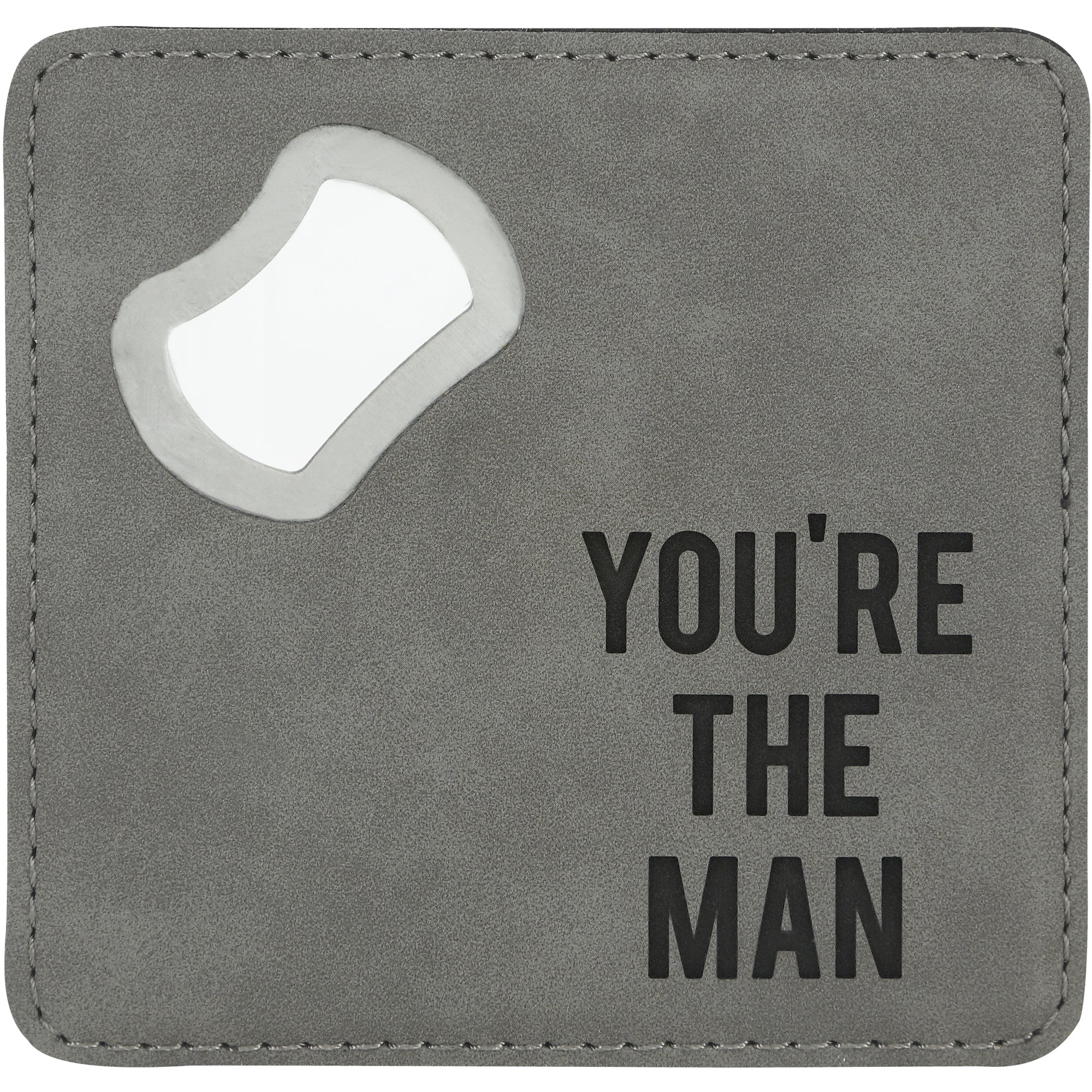 - IN-HOUSE DESIGN: "You're The Man" text is laser-printed onto the front of the bottle opener/coaster.