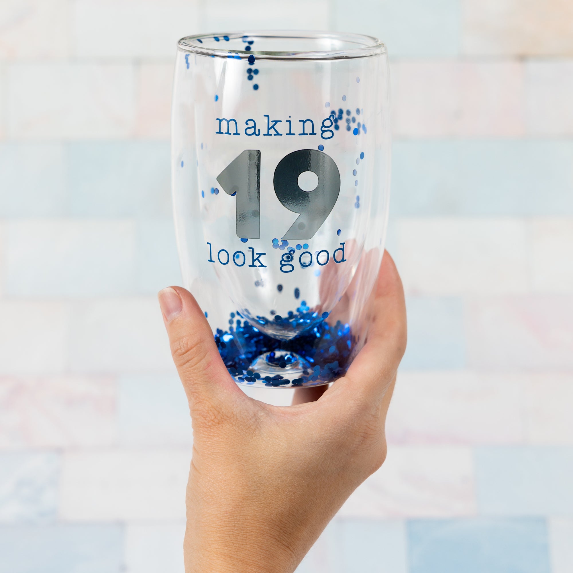 - IN-HOUSE DESIGN: The front of the glass has a silver and navy blue sentiment, "Making 19 Look Good."