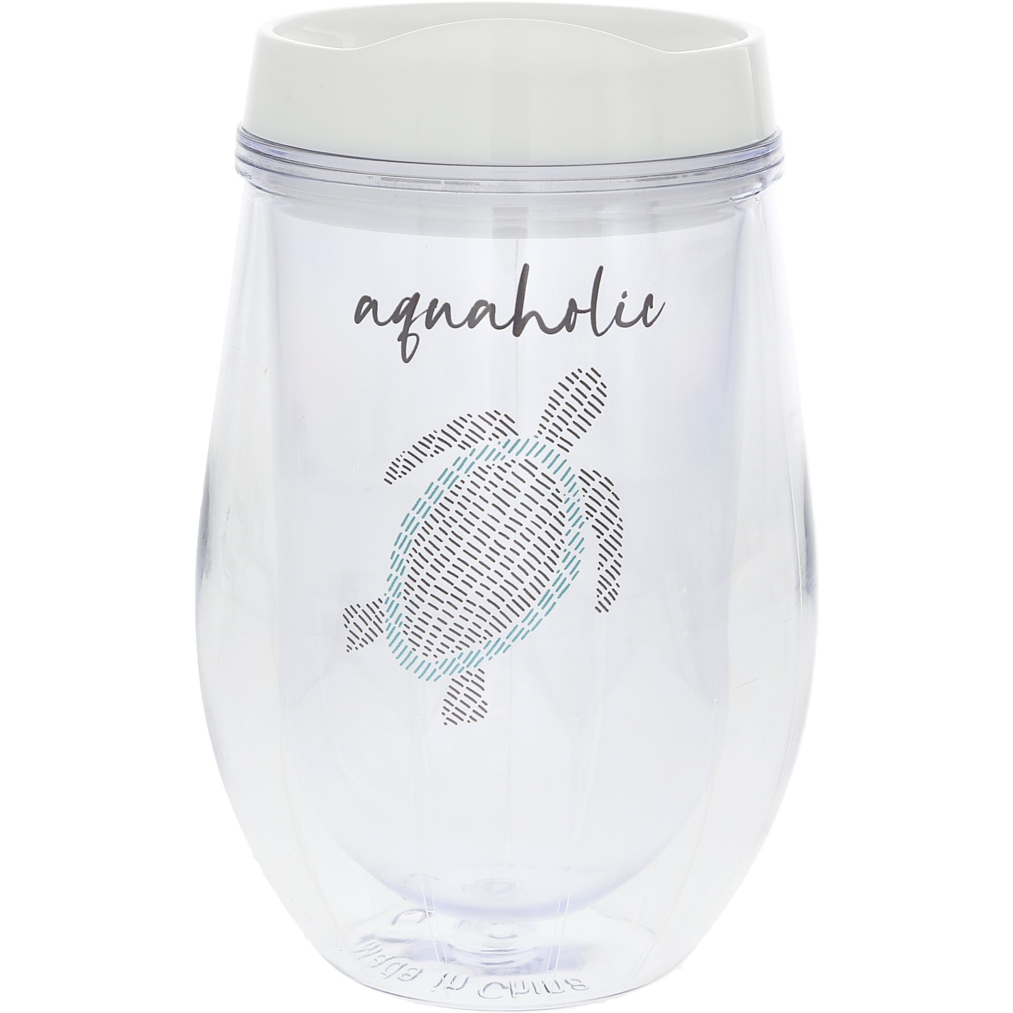 - PREMIUM QUALITY: The 12 oz Aquaholic acrylic stemless wine glass is made from Tritan, combines the beauty of glass with the durability of plastic. Its shatter-resistant and dishwasher-safe properties make it ideal for beach outings, poolside relaxation, or any setting where traditional glassware might not be practical. Featuring a push on lid with a slide to open tab; the lid helps to keep the tumbler leak proof. It’s also Prop 65 approved, meeting rigorous health and safety standards.