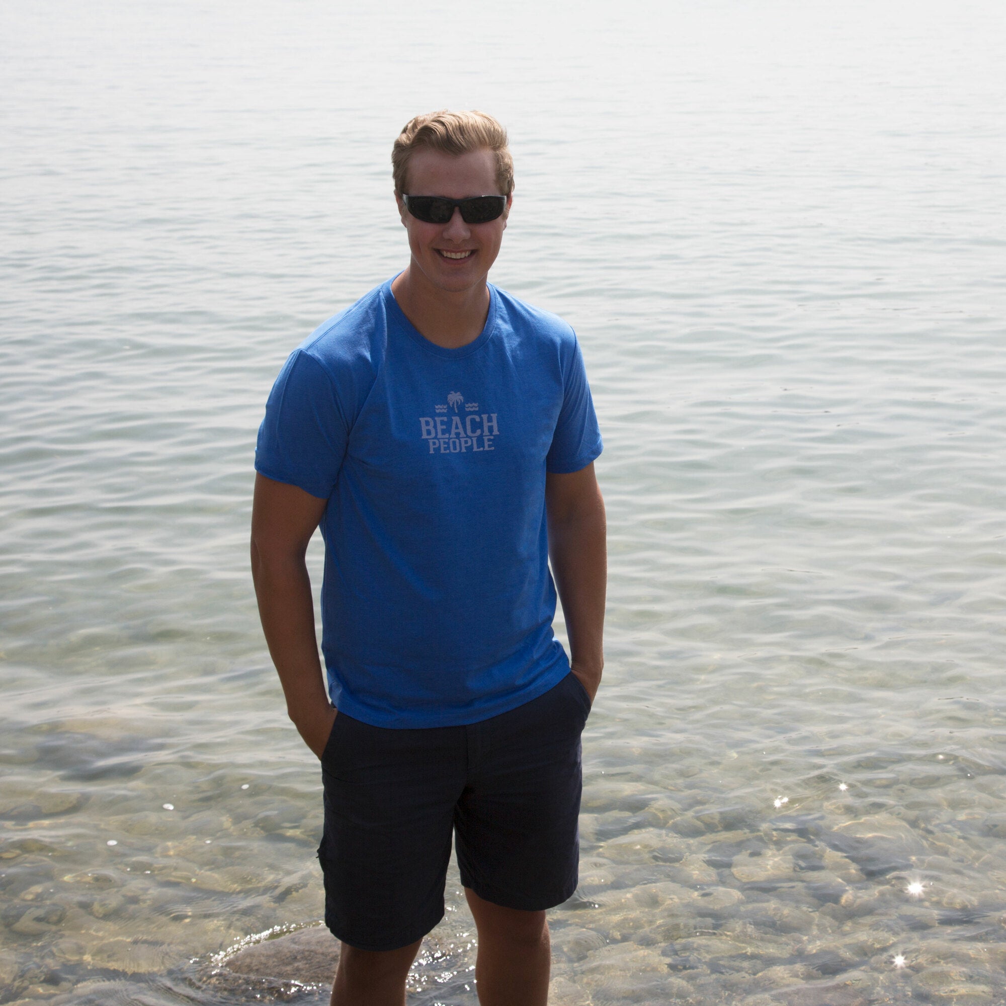 • IN-HOUSE DESIGN: "Beach People" text and logo are printed on the front of the shirt.