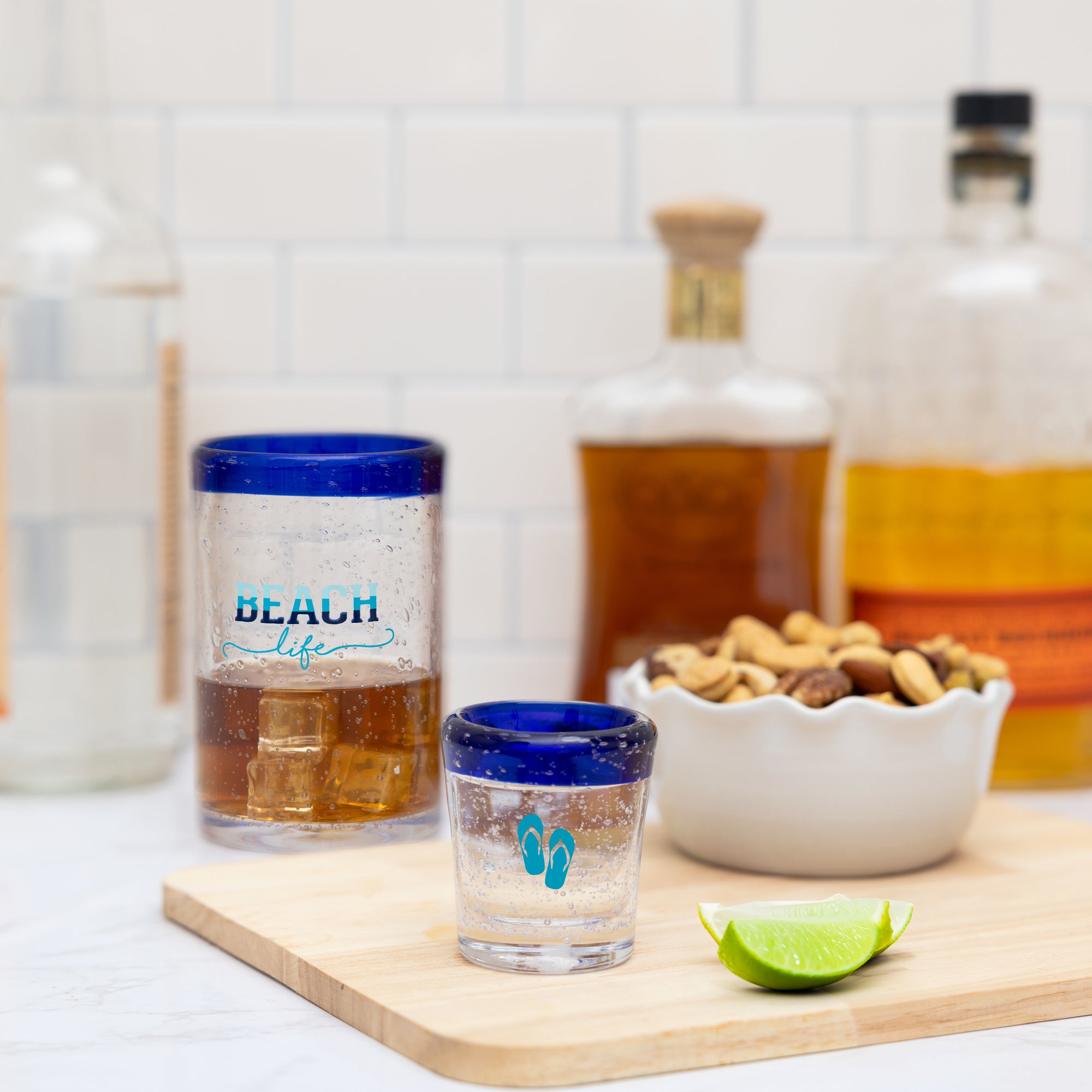 - PREMIUM QUALITY: This 2.5 oz shot glass is crafted from durable bubble glass, which gives it a unique textured look and feel. The glass features a bold, colored blue rim that enhances its beachy appeal while providing extra durability. Designed to be dishwasher safe and Prop 65 approved, this shot glass is perfect for daily use. It comes carefully packaged in a die-cut box, making it ideal for gifting and protecting the item during shipping.