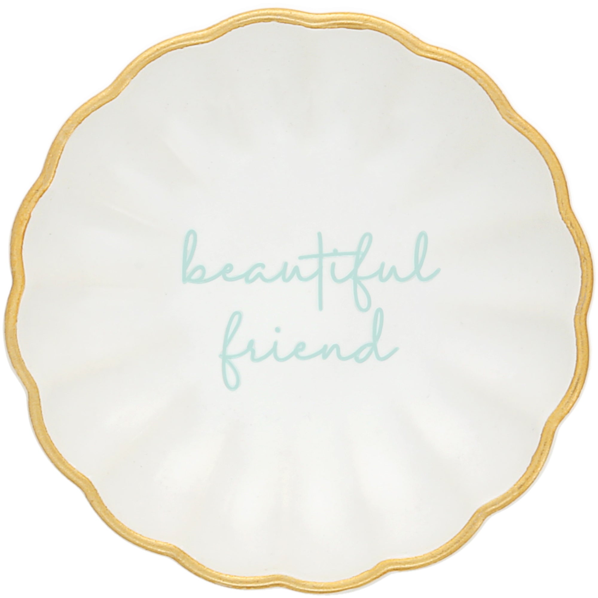 • IN-HOUSE DESIGN: Reads “beautiful friend” in soft turquoise on the dish. Coordinating packaging features a sky-blue backer card with the phrase “You are beautiful inside and out.”