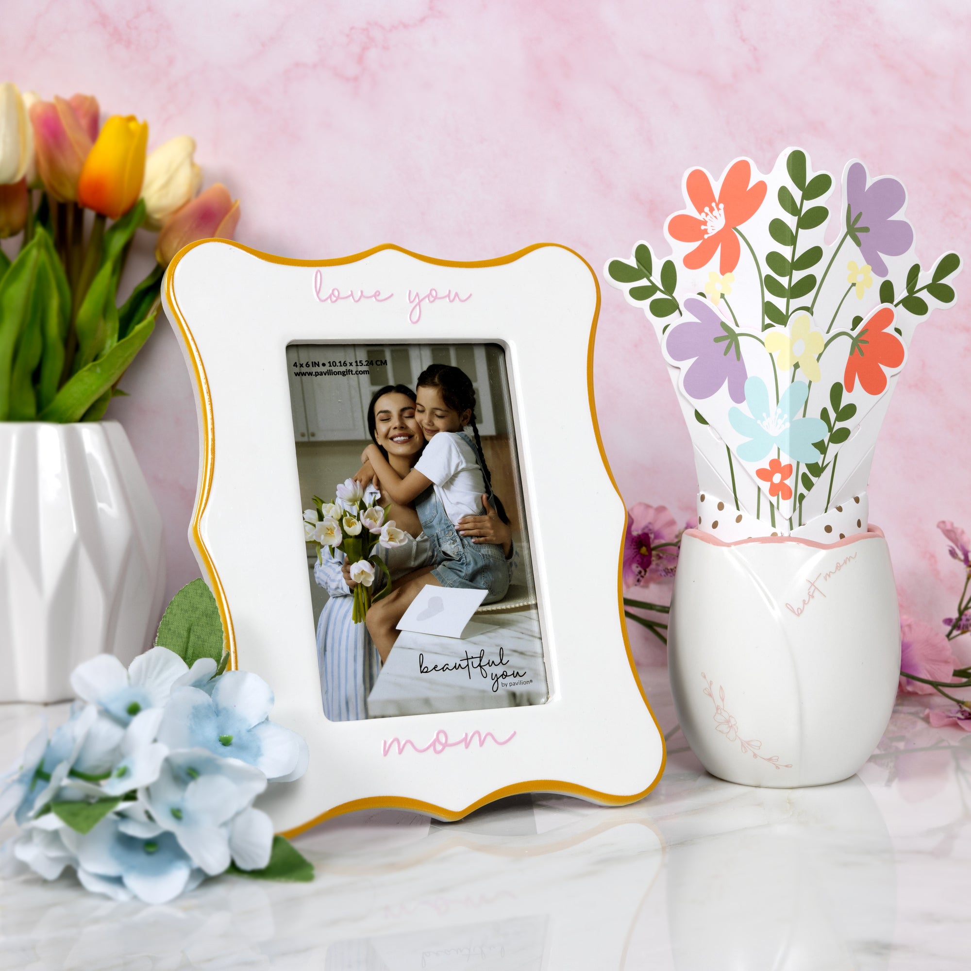 - IN-HOUSE DESIGN: Embellished with a soft pink, 3D embossed decal that reads “Love you mom” above and below the photo opening, this piece brings a delicate, loving touch to any room. The gentle pastel tones and clean white background make it a heartfelt decor accent that suits modern or traditional spaces alike.