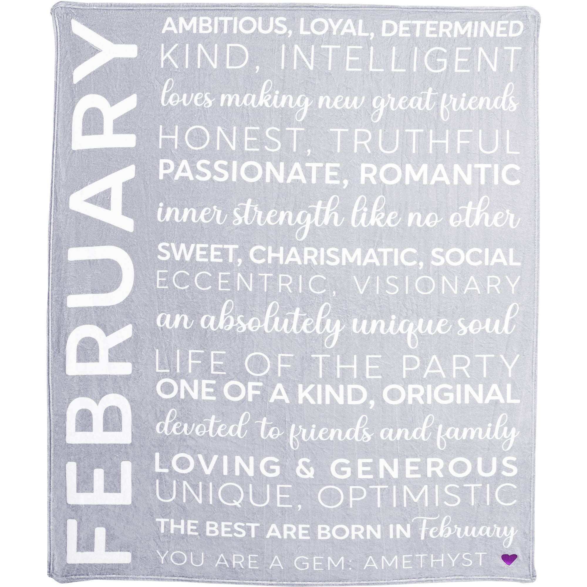 - IN-HOUSE DESIGN: The printed sentiment read "February" down the left side of the blanket along with an "Ambitious, Loyal, Determined, Kind, Intelligent, Loves Making New Great Friends, Honest, Truthful, Passionate, Romantic, Inner Strength Like No Other, Sweet, Charismatic, Social, Eccentric, Visionary, An Absolutely Unique Soul, Life Of The Party, One Of A Kind, Original, Devoted To Friends And Family, Loving & Generous, Unique, Optimistic. The Best Are Born In February. You Are A Gem: Amethyst" which consists of a san serif and cursive font combo. The purple heart in the bottom corner of the blanket is embroidered. The reverse side is white only.