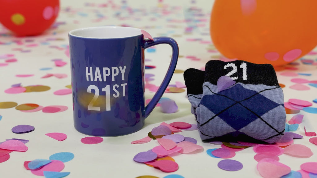 - IN-HOUSE DESIGN: "Happy 21st" white sentiment design is printed onto the front of the mug, while the socks feature sewn-in white "21" on the ankle, a blue geometric plaid argyle pattern on a blue background with dark blue ankle, heel, and toe.