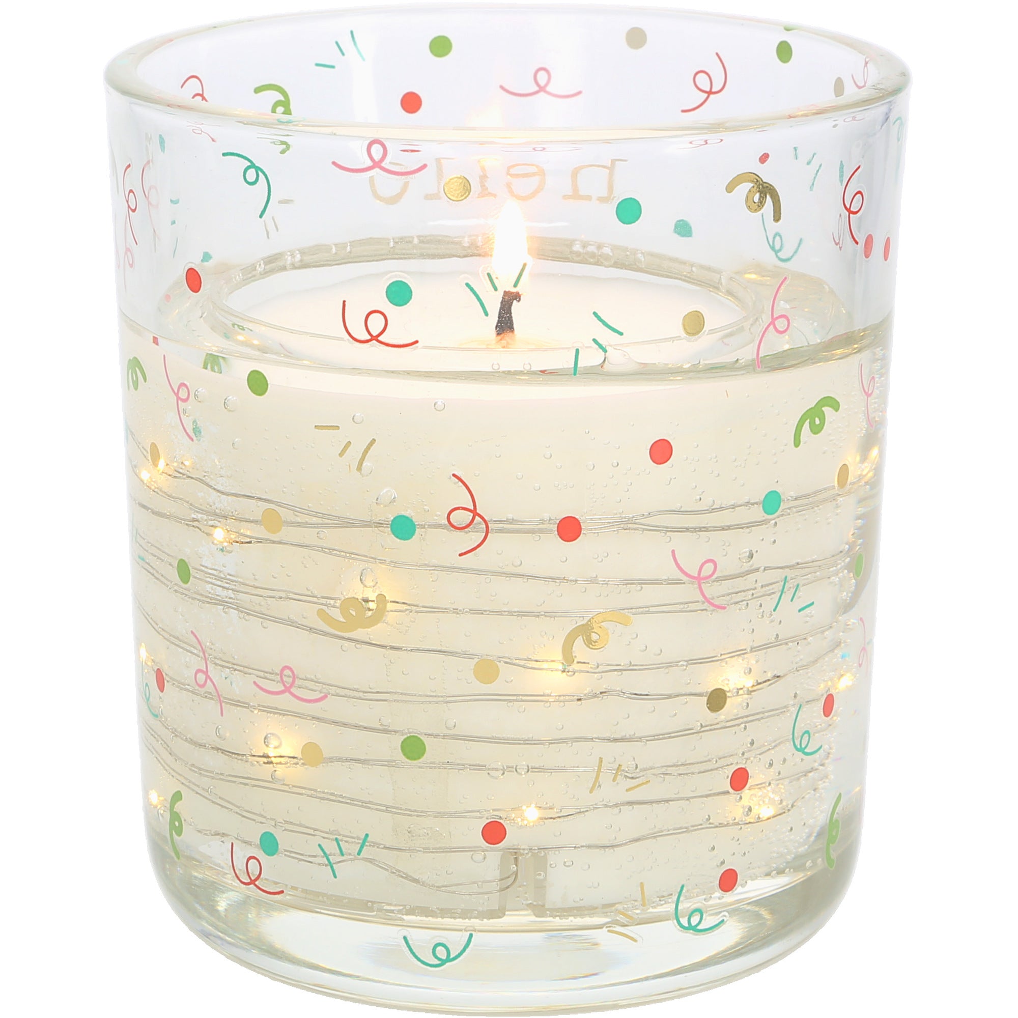 - PREMIUM QUALITY: This single-wick soy wax LED candle features a colorful confetti design on a sturdy glass vessel. The "Hello 50" gold metallic text is prominently displayed alongside festive balloons, adding a celebratory touch. This candle can be lit or you can use a candle lamp to activate the LED lights. Packaging includes a Kraft die-cut box, making it gift-ready.