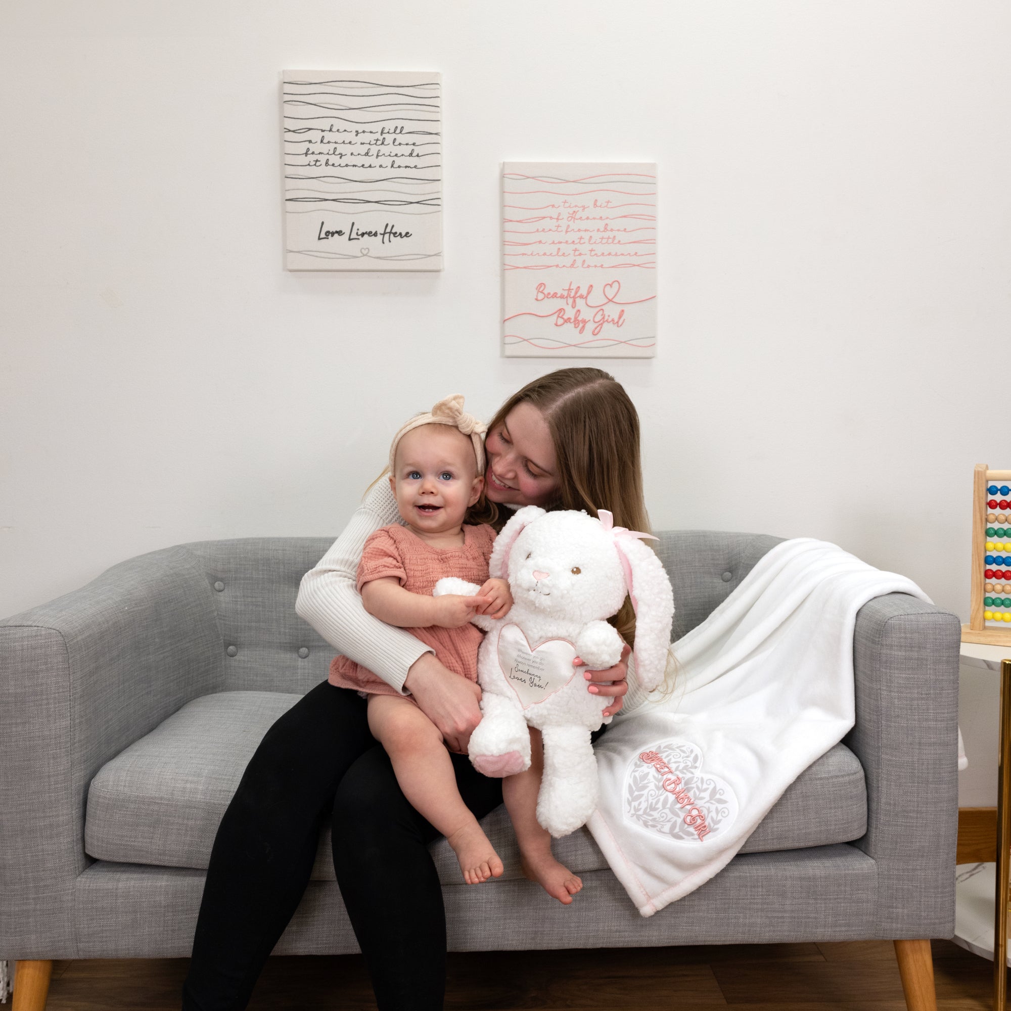 - CARE INSTRUCTIONS: Our bunny is designed for convenience. Simply machine wash it cold on a gentle cycle with like colors. No need to worry about bleaching or ironing. Just tumble dry it low and it's ready for use again. It is packaged with a paper heart hang tag inside of a plastic polybag. Be sure to remove all packaging before giving the item to your baby.