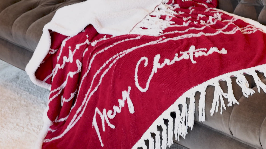 • IN-HOUSE DESIGN: Risen cursive sherpa "Christmas Is Here In Our Hearts And Minds, With Holiday Cheer All Around Us, And Gifts Of Every Kind. Believe In The Magic This Season Will Bring, And Always Be Grateful For Each Blessing. Rejoice In The Spirit Of Christmas Night Knowing All Will Be Merry And All Will Be Bright. Merry Christmas" sentiment is conveyed by wave-like thread lines connecting the ends of the words to the edge of the blanket on beautiful warm red background.