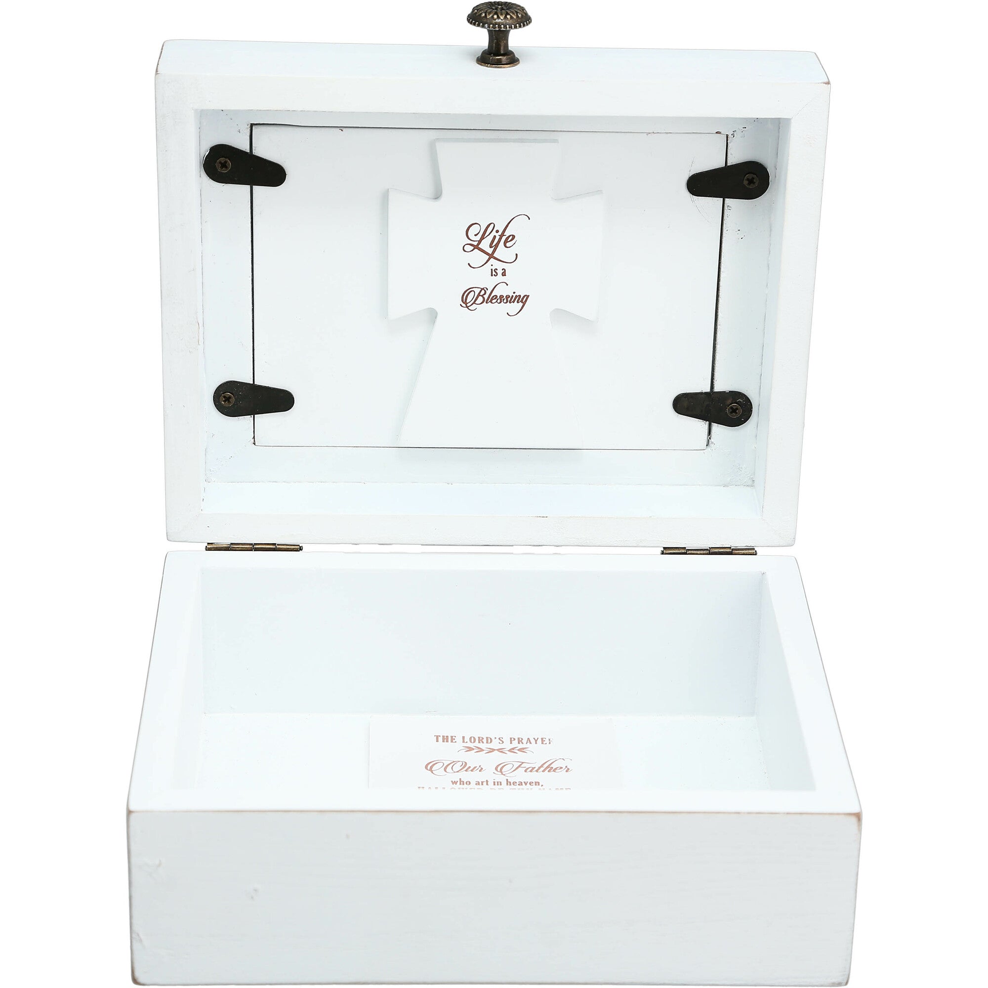 - IN-HOUSE DESIGN: The white overall finish is rustic. The MDF backing has a bronze "Take Time To Pray" sentiment and some greenery above and below that can be seen through the glass cover. The interior 3D cross has another bronze metallic sentiment, "Life Is A Blessing." Lastly, the metallic printed card has the "The Lord's Prayer: Our Father Who Art In Heaven, Hallowed Be They Name; Thy Kingdom Come; Thy Will Be Done On Earth As It Is In Heaven. Give Us This Day Our Daily Bread; & Forgive Us Our Trespasses & Lead Us Not Into Temptation, But Deliver Us From Evil. Amen." prayer included.