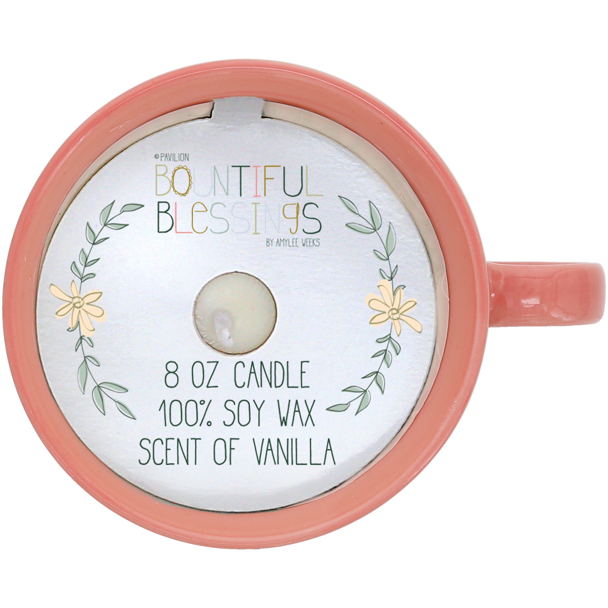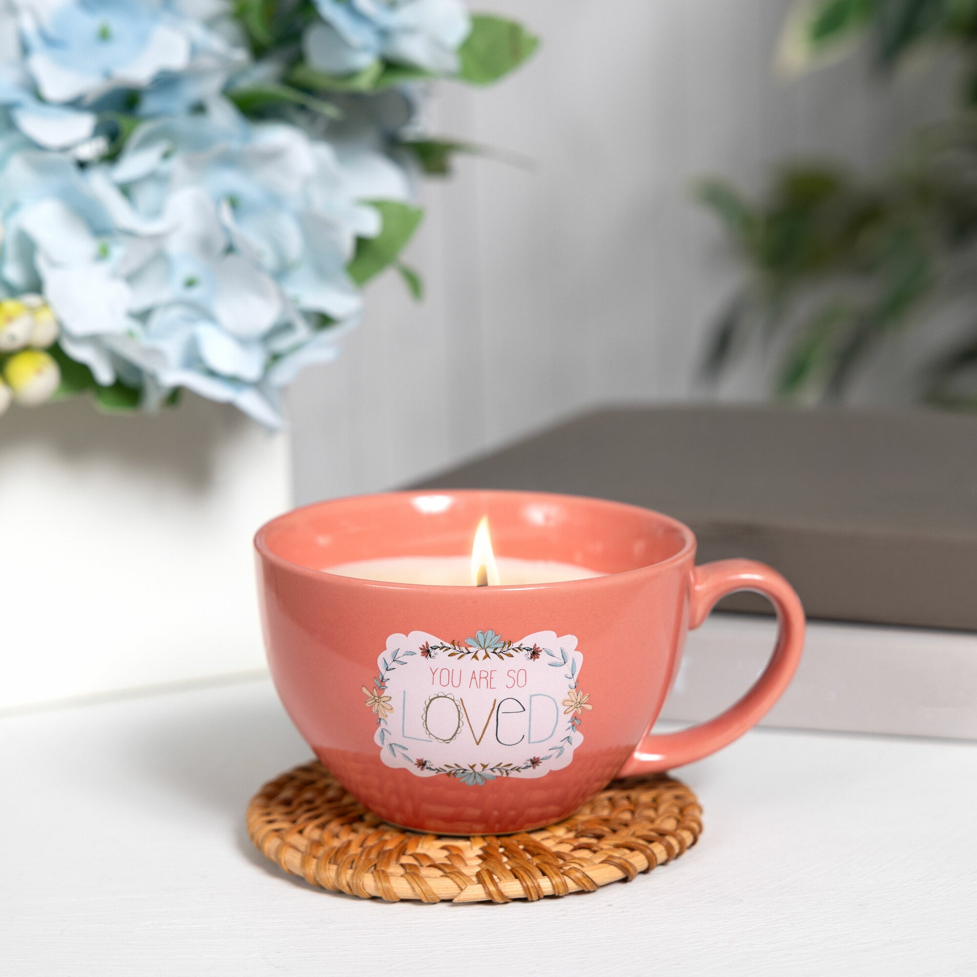 - IN-HOUSE DESIGN: A soft blush-pink teacup is adorned with a floral wreath and the loving sentiment "You are so loved" on the front decal. Coordinating artwork decorates the candle surface, tying the message and design together.