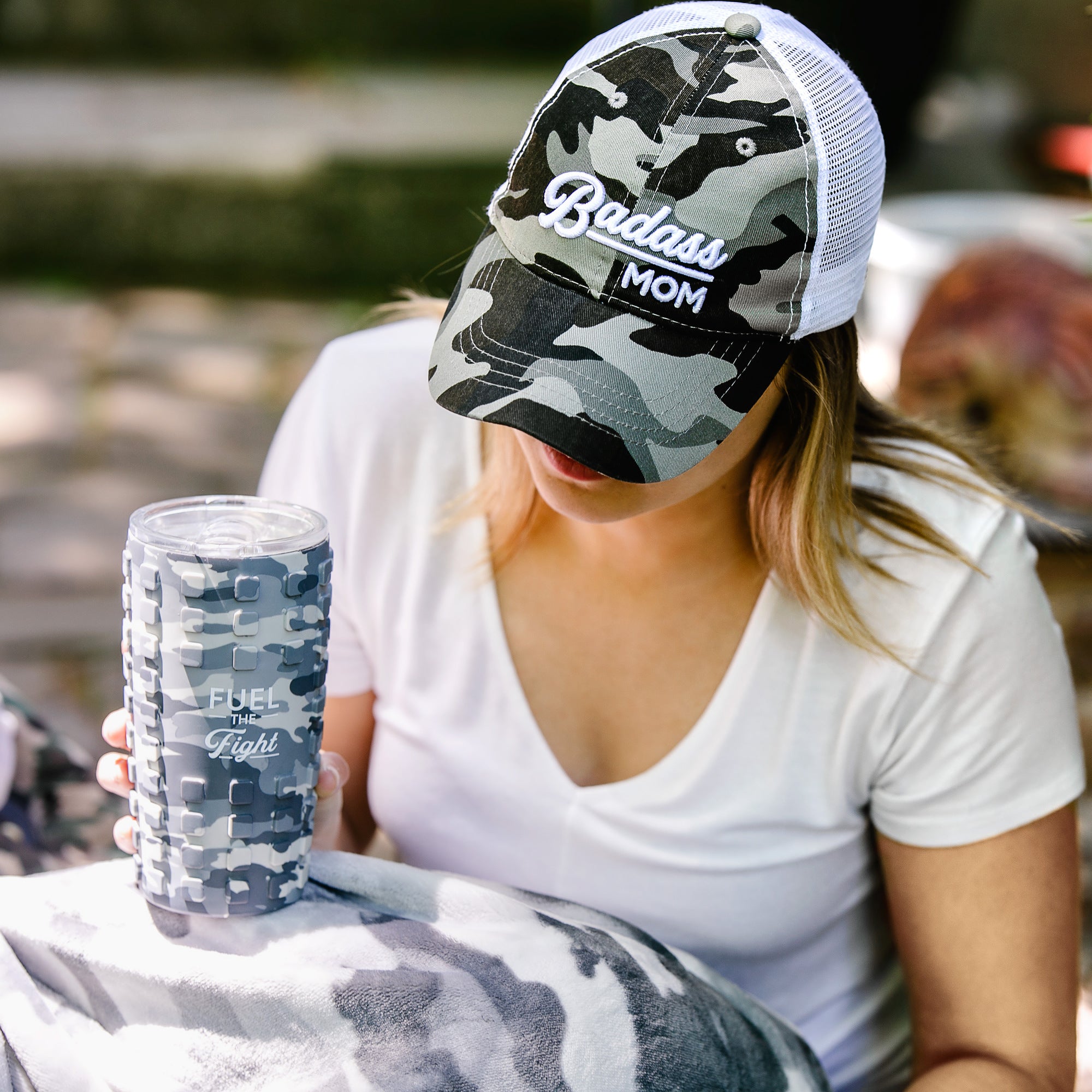 - IN-HOUSE DESIGN: "Fuel The Fight" text is printed onto the front of the camouflage-patterned tumbler.