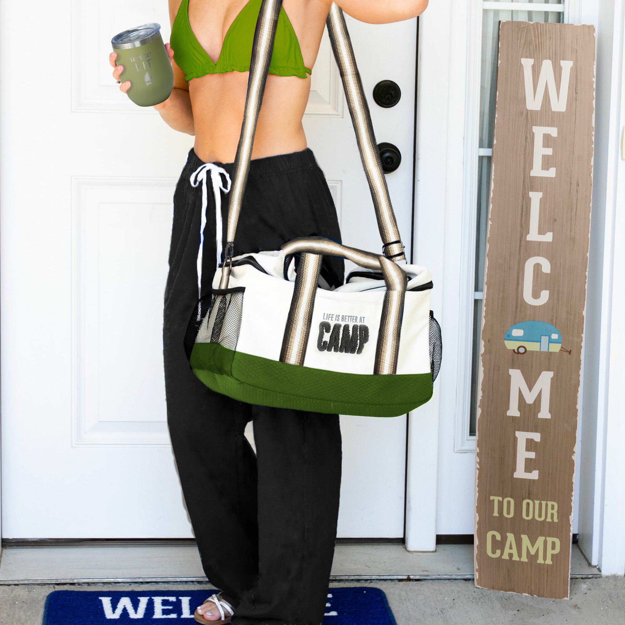 - IN-HOUSE DESIGN: The back has been left as natural wood. The sides have a rustic white paint finish. The front side has a rustic white edge finish, a tan background, and a large letter, "Welcome To Our Camp," with white, light green, and teal sentiment. The "O" in welcome is a camper RV.
