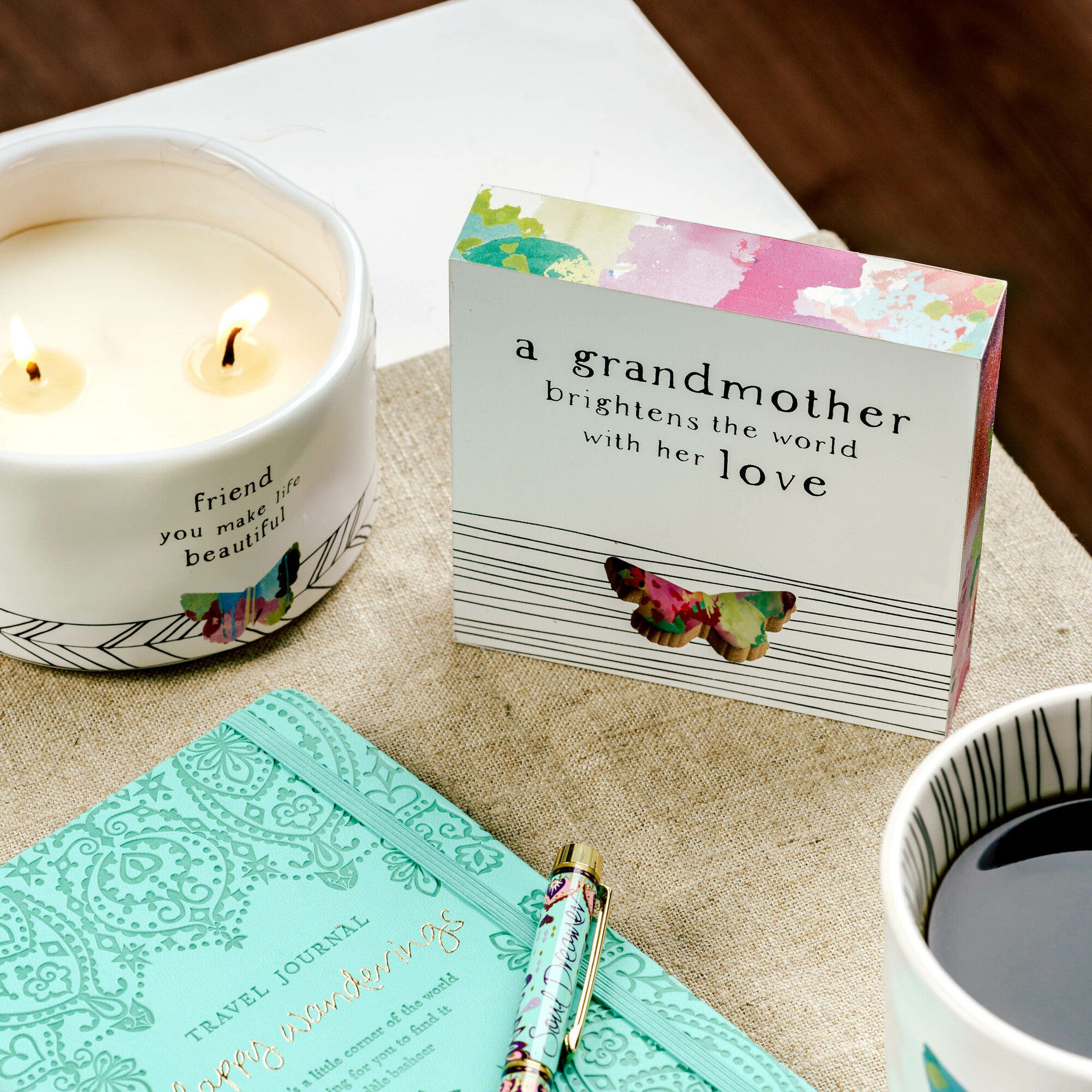 - IN-HOUSE DESIGN: "A grandmother brightens the world with her love" text is in black. Plaque has a recessed multicolored butterfly centered on the front. The back and edges of the plaque have a multicolored paint scheme consisting of pink, blue, yellow, green, purple and orange. Exact colors may vary. This sturdy plaque will set nicely on a desk or window sill or can be hung up.