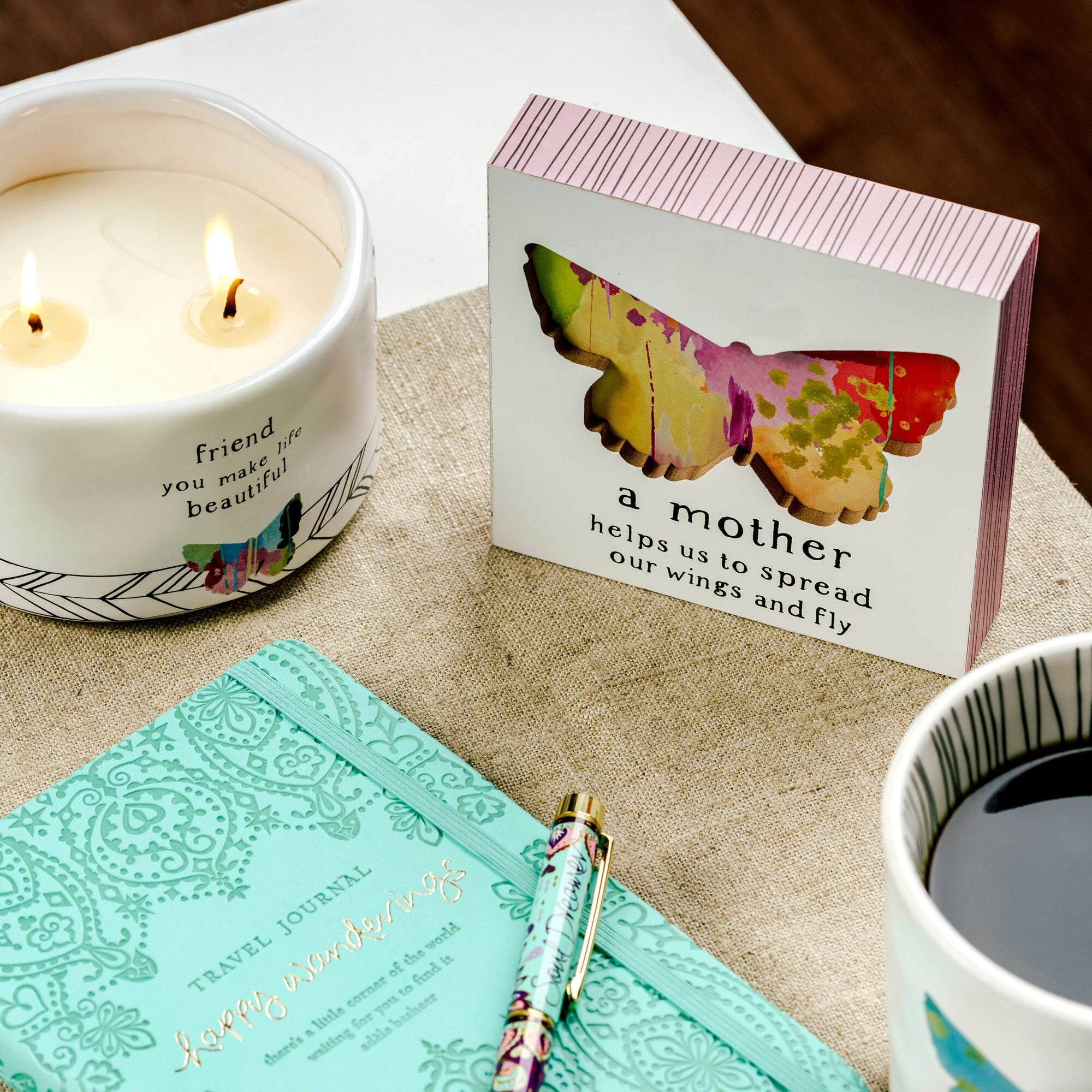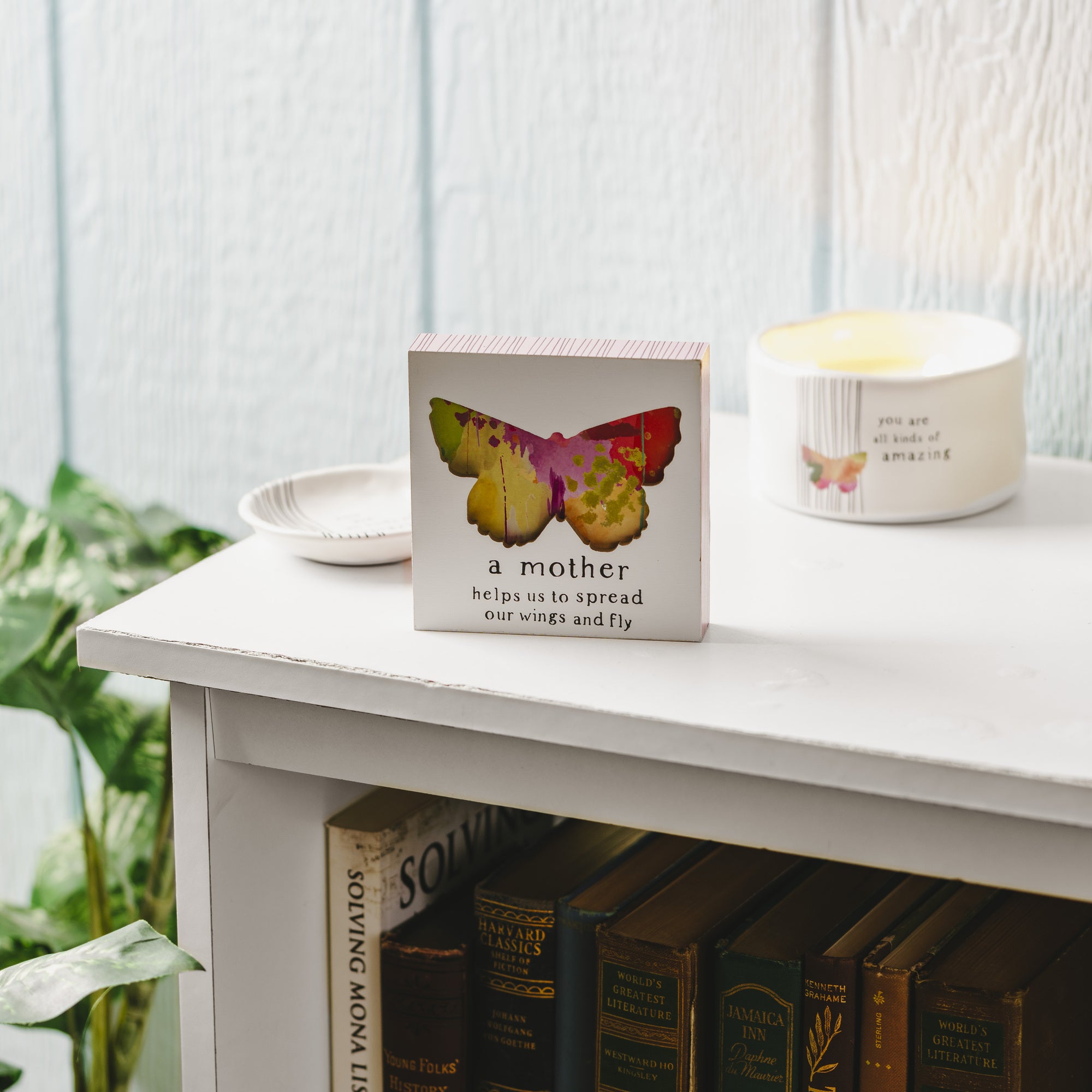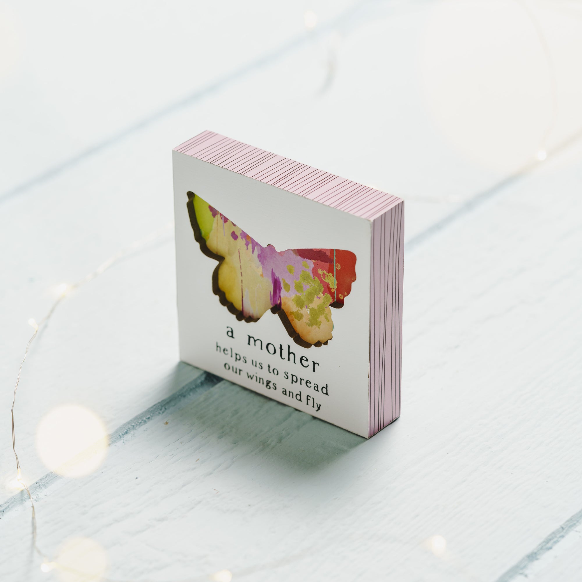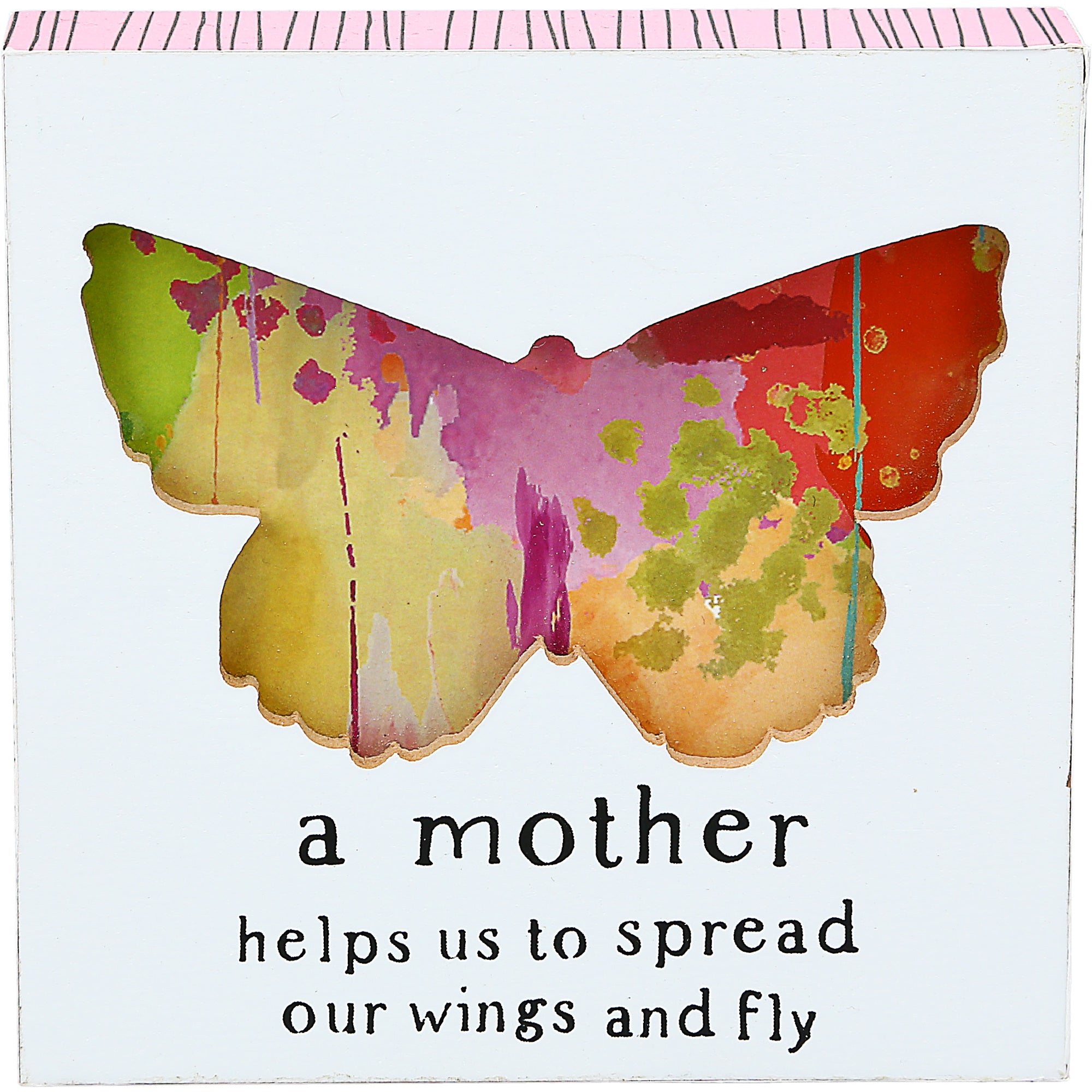 - IN-HOUSE DESIGN: "A mother helps us to spread our wings and fly" text is in black. A recessed large butterfly is centered in the middle of the plaque with a multicolored paint scheme. Back and edges of plaque are a base of pink paint with thin black striping. This sturdy plaque will set nicely on a desk or window sill or can be hung up.