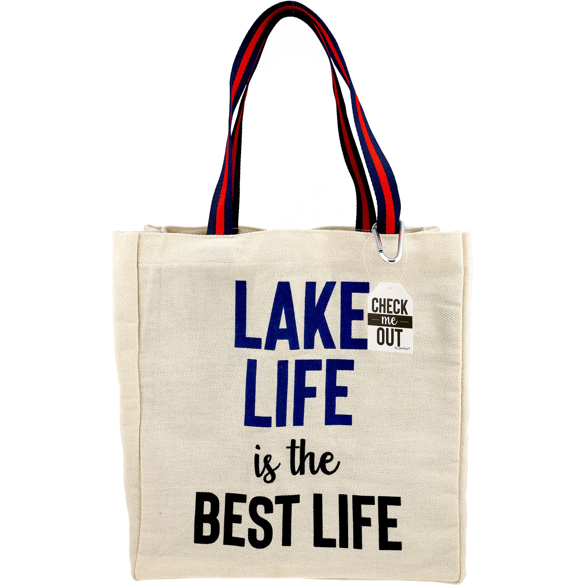 - IN-HOUSE DESIGN: "Lake Life Is The Best Life" blue & black text is printed onto one side of the cream/beige neutral-colored shopping bag. The thick blue & red double-handle straps can help held on your forearm or shoulder and support ~15 pounds of food/drinks. The clip is NOT meant to hold items inside while shopping in the store and clipped to the cart. These economical lightweight cloth bags were created by our in-house artists to bring a little humor to your shopping experience.