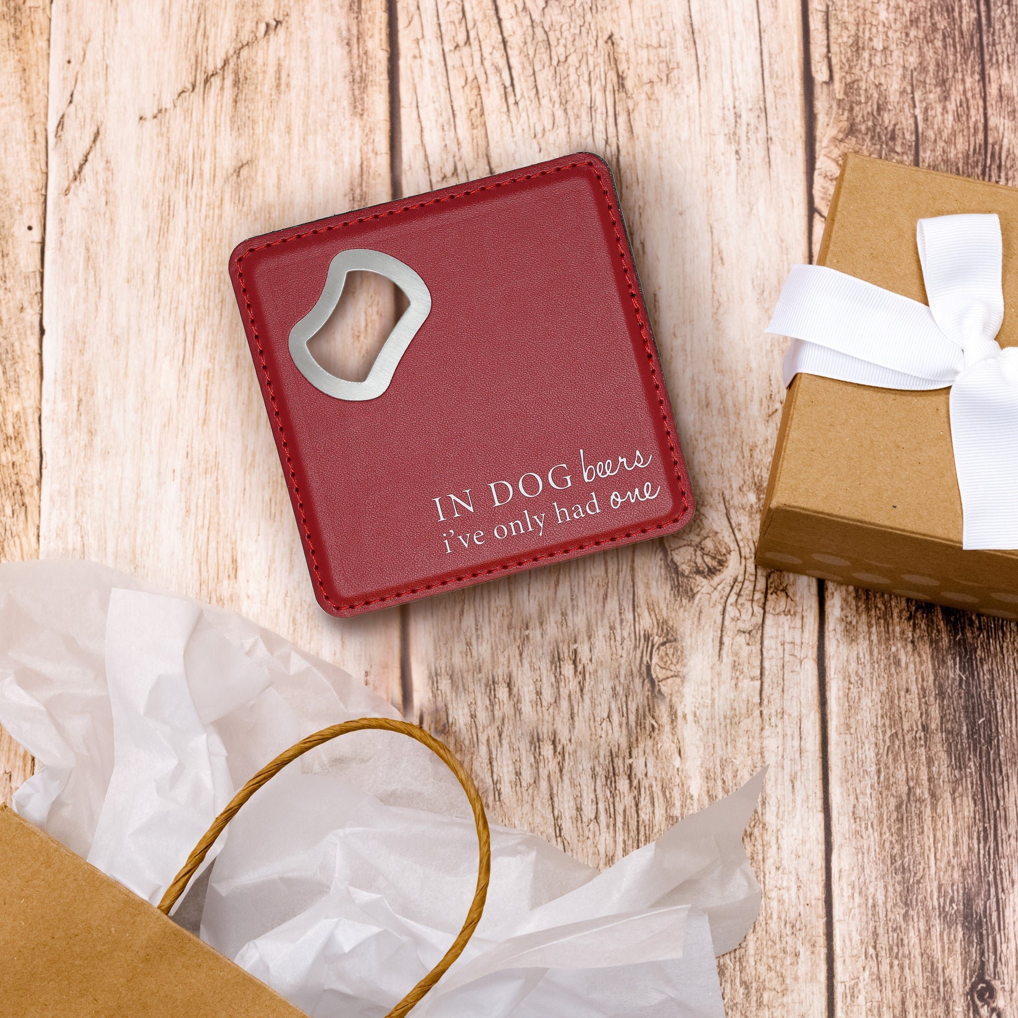 - IN-HOUSE DESIGN: "In Dog Beers I've Only Had One" white cursive & serif fonts are laser engraved into the bottom right corner of the front of the beverage coaster/beer mat. Your friends and family will love the superior premium design; they'll also want one!