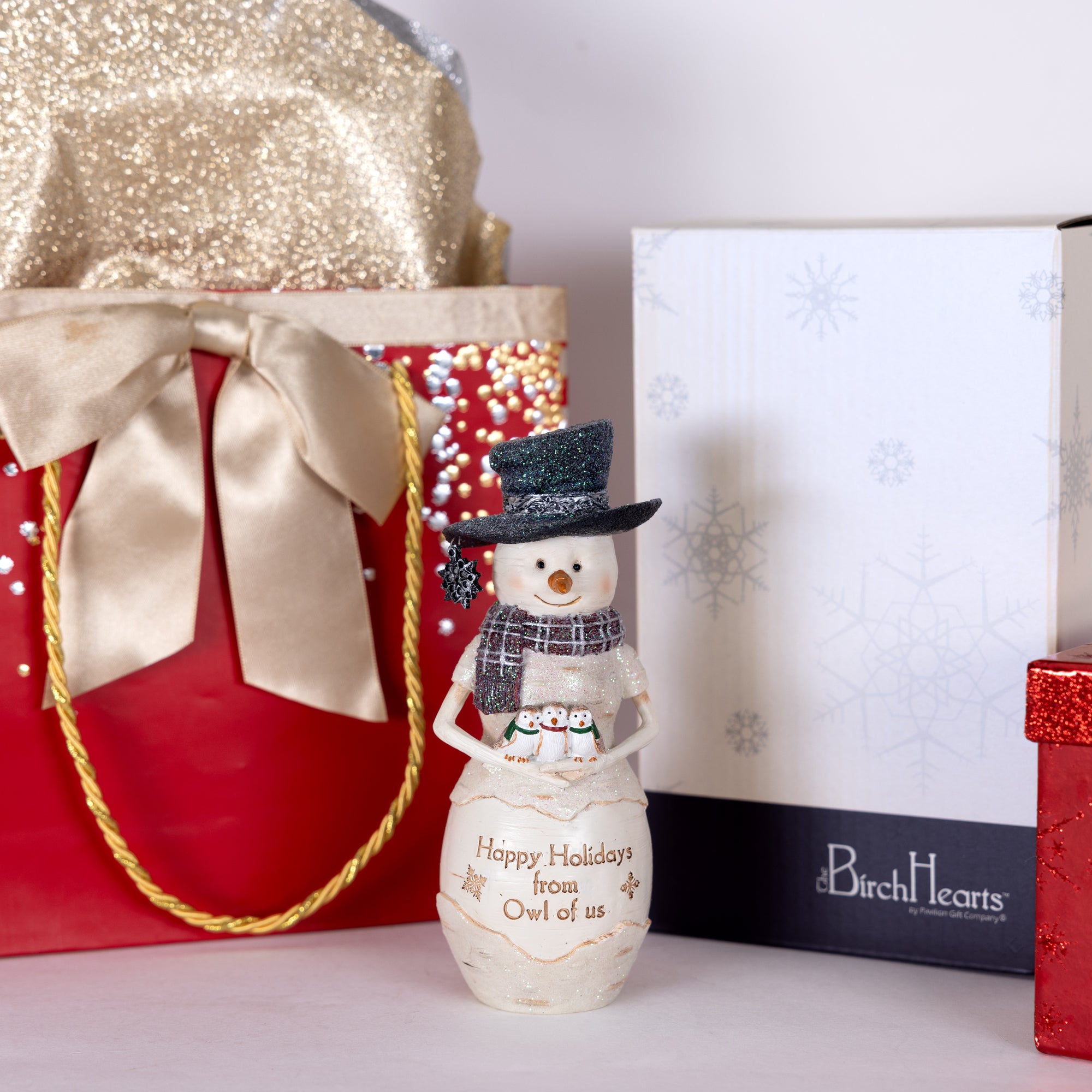 - IN-HOUSE DESIGN: "Happy Holidays from Owl of Us" text is debossed and hand-painted onto the front of the figurine. The snowman figure features a dangling snowflake, brushed nickel, Birchwood accents, and signature snowflake detailing. The snowman is topped with glitter, making this figurine the perfect choice for your holiday décor.