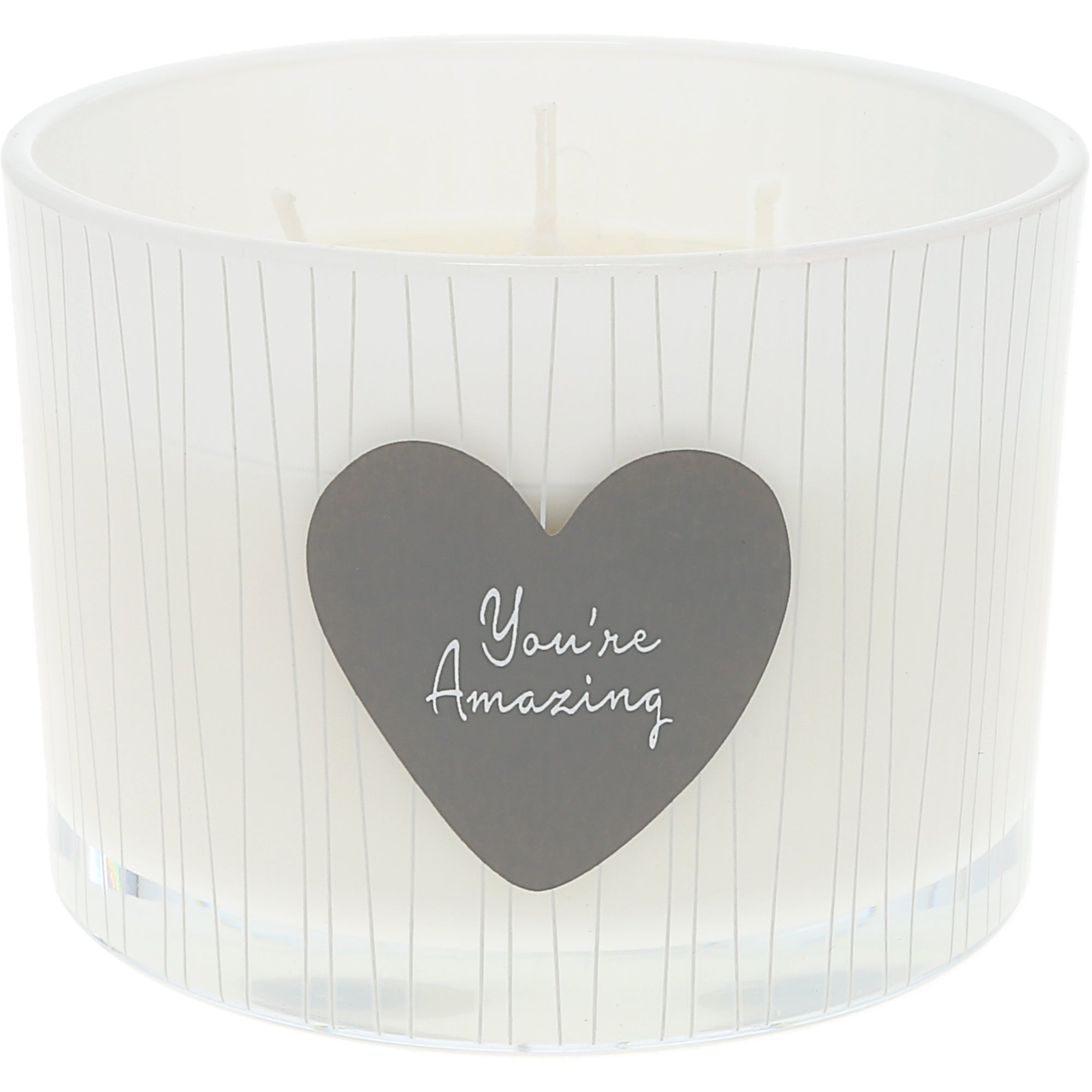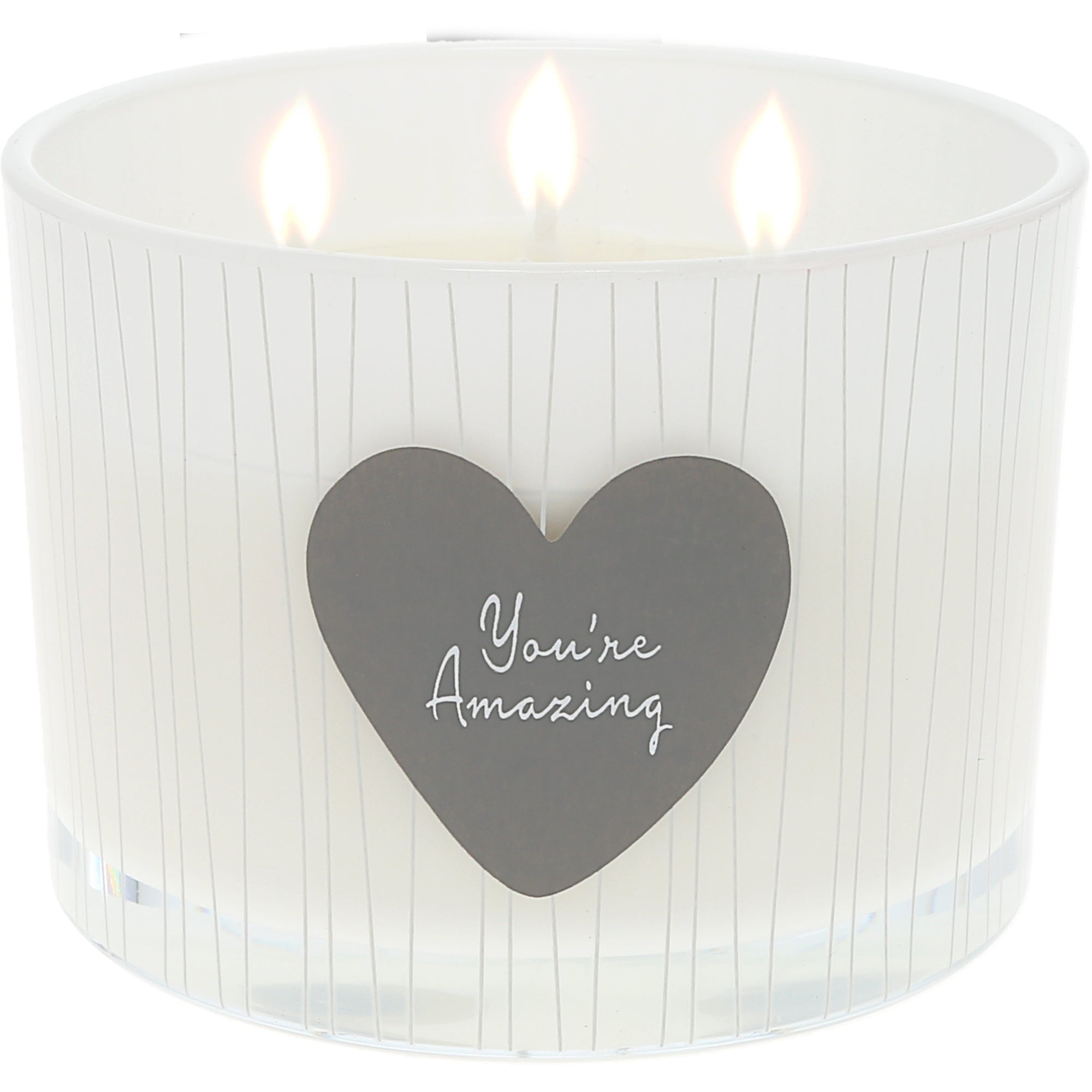 - PREMIUM QUALITY: Crafted from 100% soy wax for cleaner burning, this 11 oz candle is housed in a modern matte white vessel with pastel pinstripes and a charcoal heart reading “You’re Amazing.” Cotton wick provides steady, even burning with a soft, relaxing glow. Packaged in a white die-cut box for gifting.