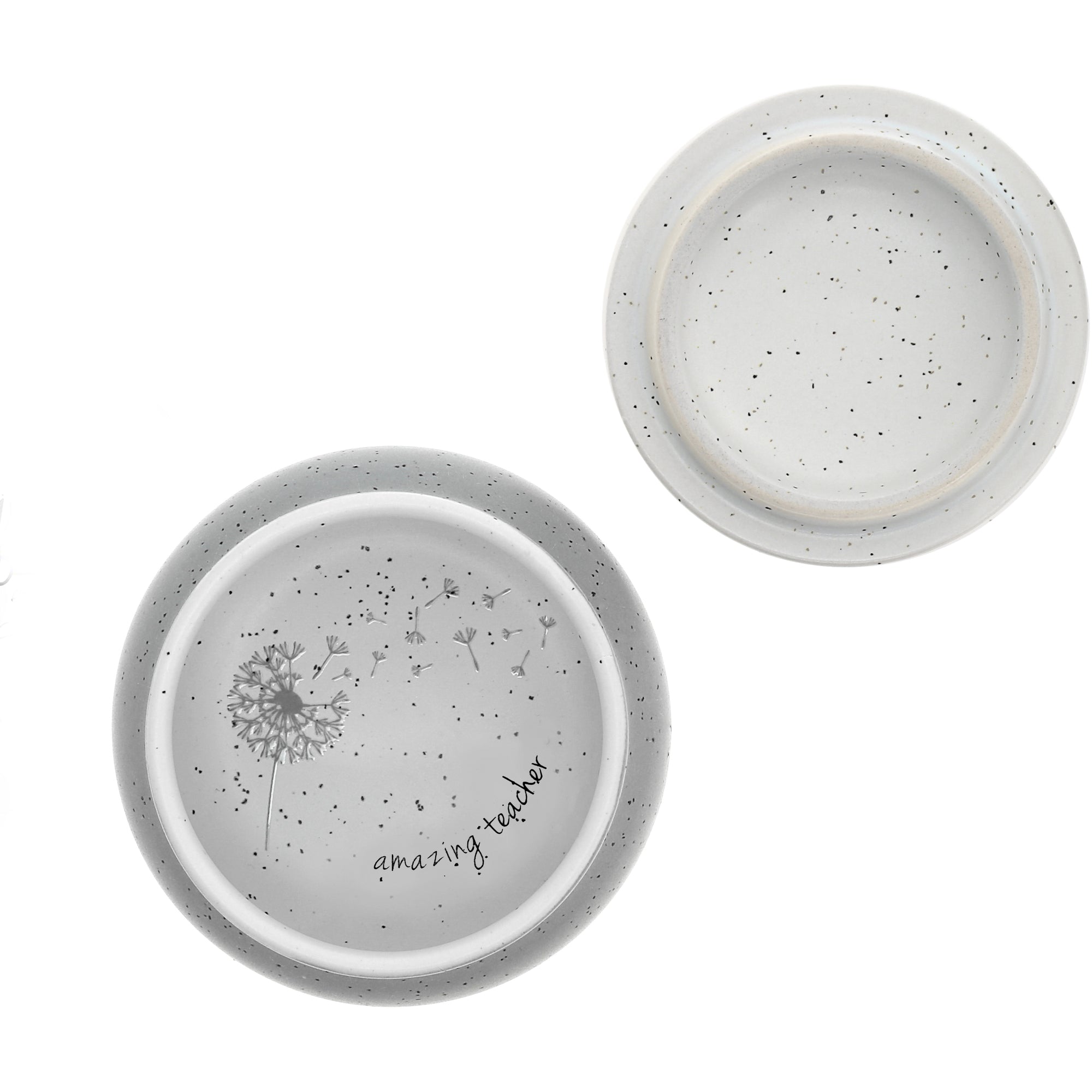 - IN-HOUSE DESIGN: The dish's lid has a simplistic "I Always Wished For A Teacher Like You" decal accompanied by a light gray dandelion seed. At the same time, the interior features a dandelion blowing into the wind, accompanied by an "Amazing Teacher" sentiment that hugs the bottom of the jar.