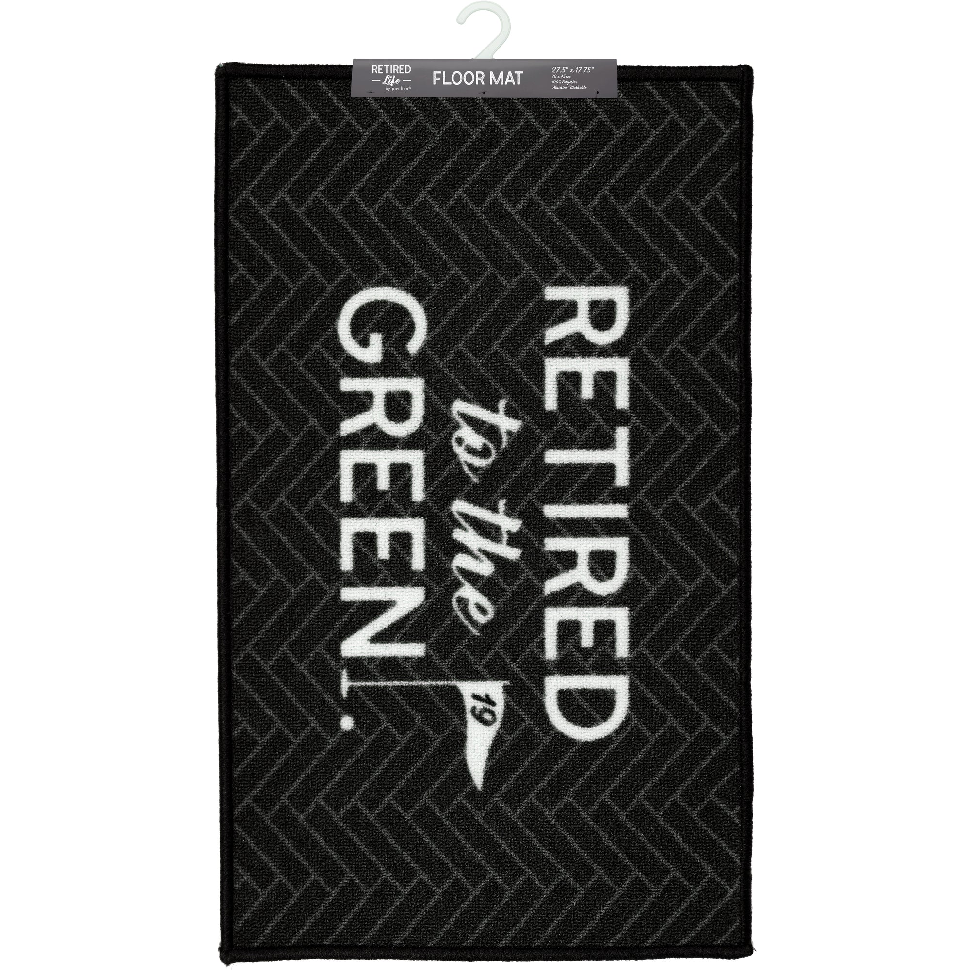- IN-HOUSE DESIGN: The gray rug has a herringbone printed pattern in light gray. The white "Retired To The Green" sentiment is accompanied by the "19" flag marker and golf ball.